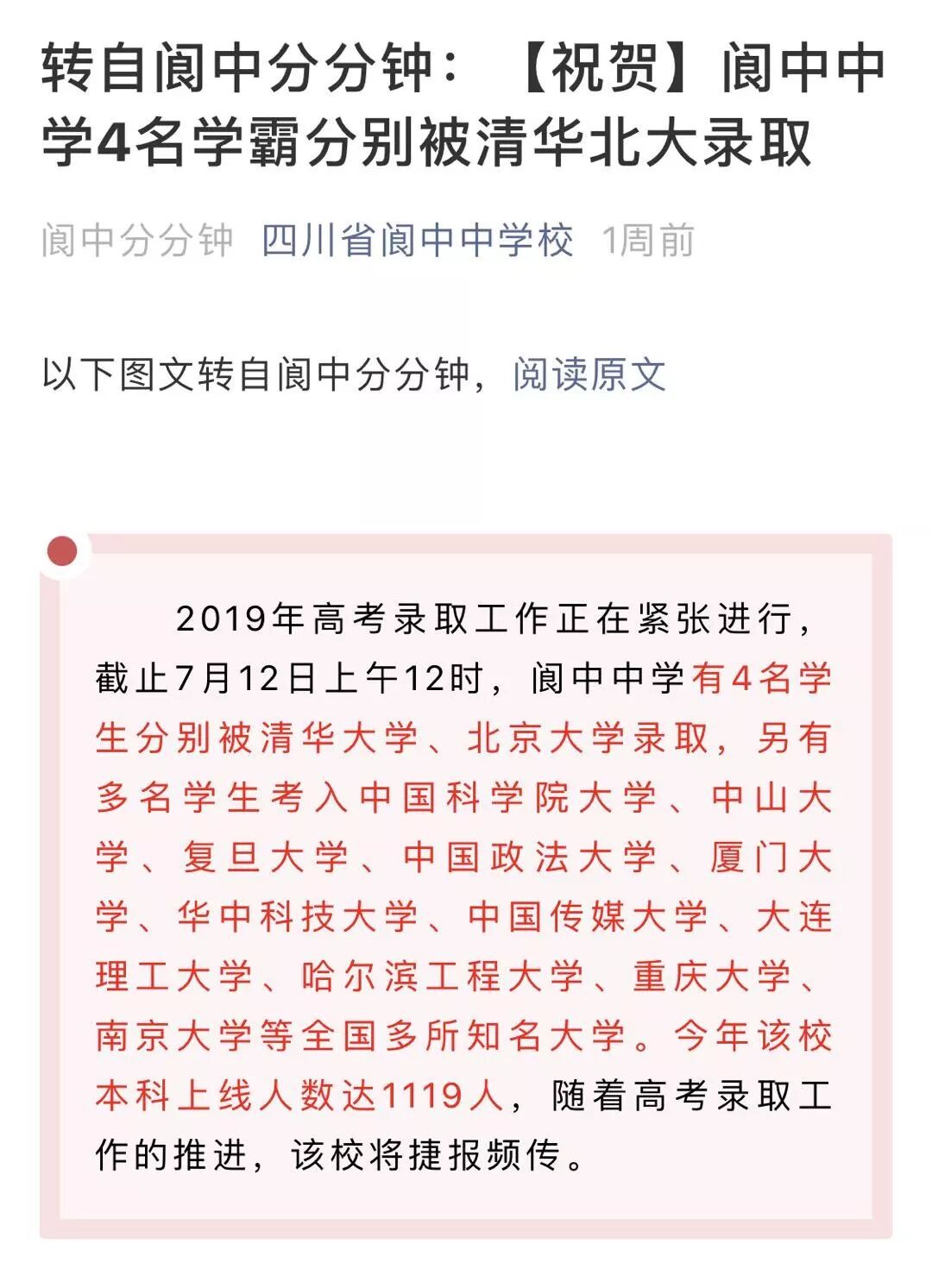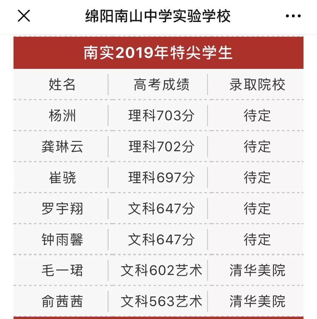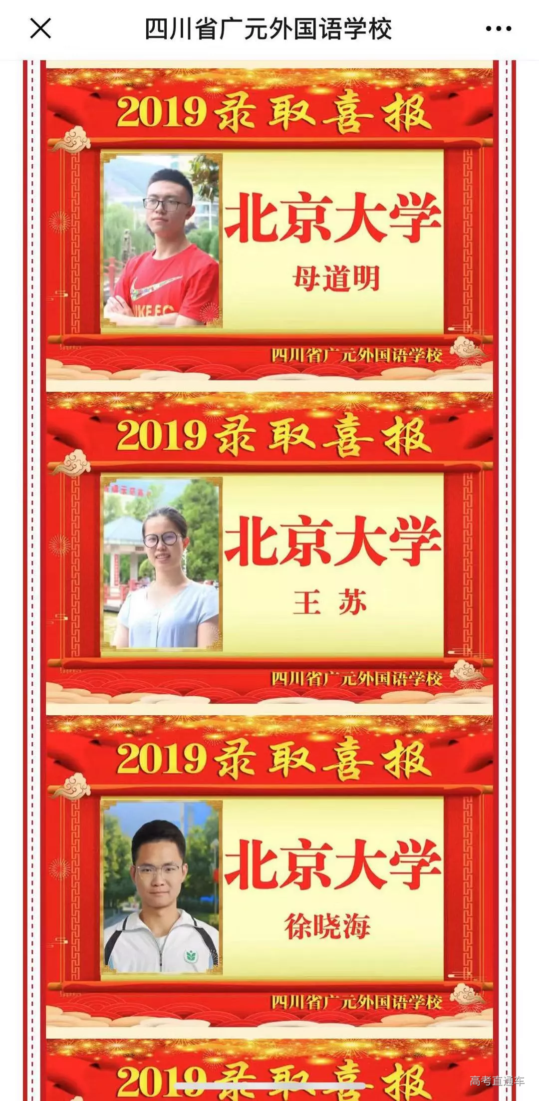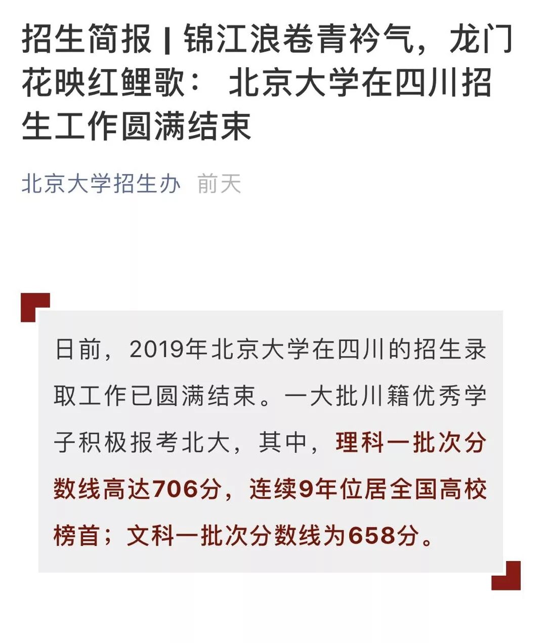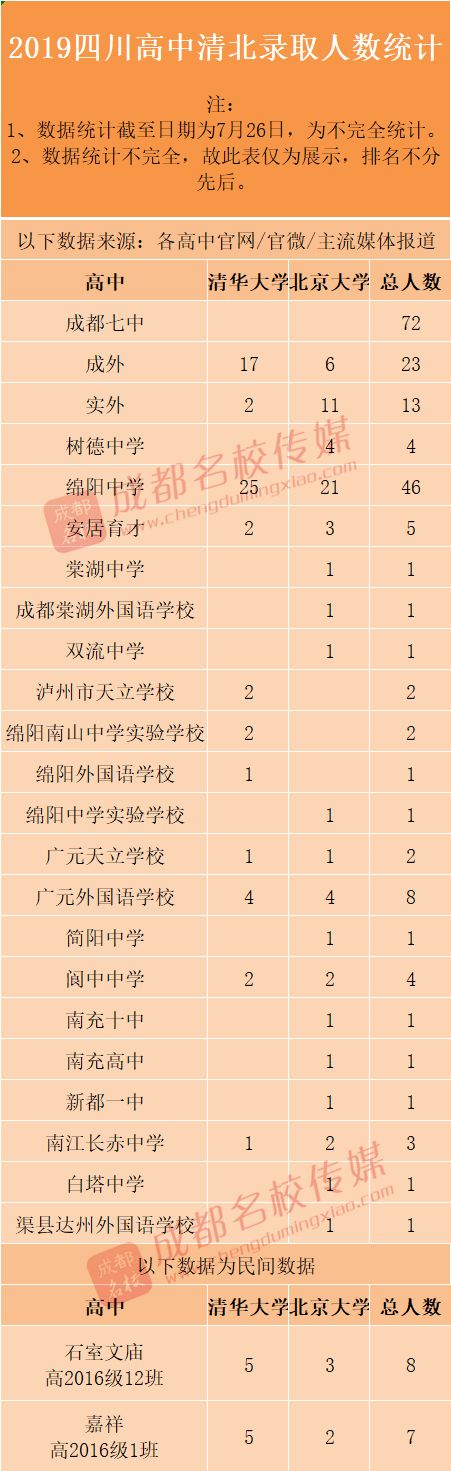 随着四川省提前批及本科一批次招生工作的结束,四川各高中也陆续公布了本校的录取成绩。 小编查阅各高中官方微信及官网,搜集了川内清华、北大录取情况。 截止7月26日,不完全统计,2019年,四川省210人考入清华、北大。其中,成都七中72人,成外23人,绵阳中学46人。 特别说明:以下数据是小编通过各校官网、官微及主流媒体等报道中搜集到的,为不完全统计。 先看总表~ 成都外国语学校 7月24日,成外官微发布文章《23人上清华北大——成外高2016级高考简报》,文章显示,2019年,成外考入清华、北大的学生有: 清华大学: 郑蘅夏、胡馨允、胡睿、向蕾陶、李巧艺、付若童、倪瑞新、黄瑞涵、邹宇涵、董瀚林、李坤应、王雨霖、吕滨睿、李斯威、谢沛君、郭鹏、贺宁怡 北京大学: 董逸飞、张雅文、邓一炜、毕盛、李思睿、孙竹筠 树德中学 7月24日,北京大学发布在川招生情况,文章显示,2019年,北京大学在川理科一批次分数线高达706分,连续9年位居全国高校榜首;文科一批次分数线为658分。 同时,文章报道了树德中学考入北大的4位学生: 吴亦晨、刘双祺、桑子洋、曾致霖 安居育才 清华大学:赵晨洋、黄煜展 北京大学:何之洲、马俊、何俊铭 绵阳外国语学校 黄文志 清华大学 棠湖中学 北京大学:付乡月 双流中学 北京大学 文星朗 广元天立学校 清华大学:赵书漾,703分,广元市理科第一名 北京大学:程云果,工科试验班类,707分,含北大“博雅计划”10分加分 简阳中学 刘星宇 北京大学 南充十中 北京大学:朱宴余,理科712分 渠县达州外国语学校 北京大学:罗欢 新都一中 北京大学:宋汶航 以下数据为民间统计: