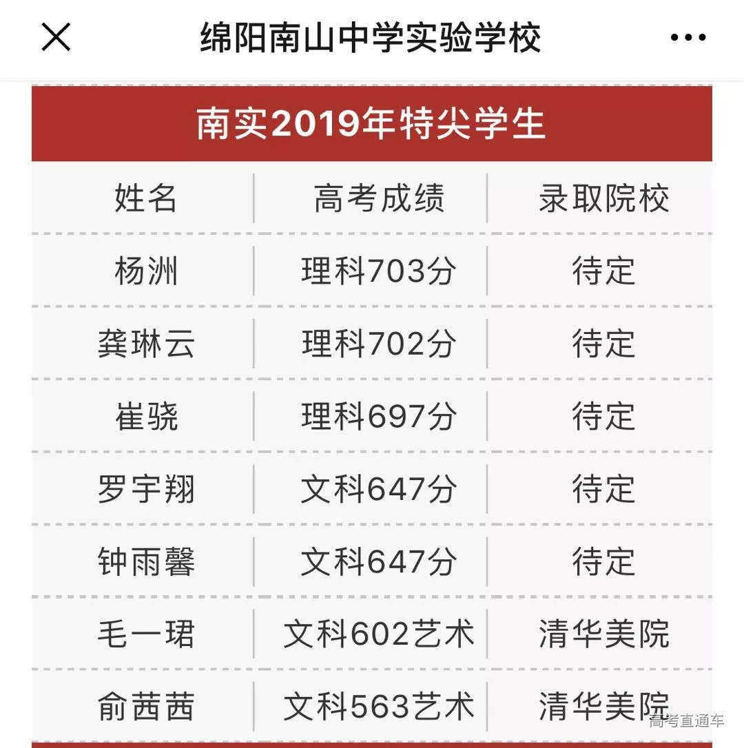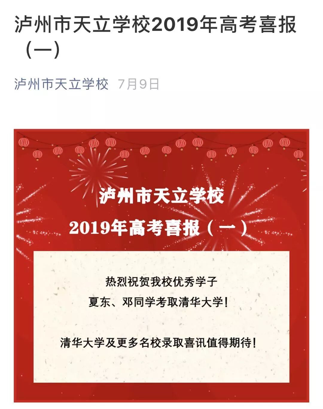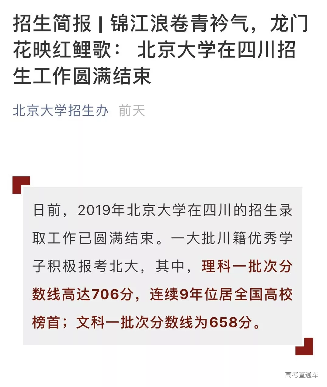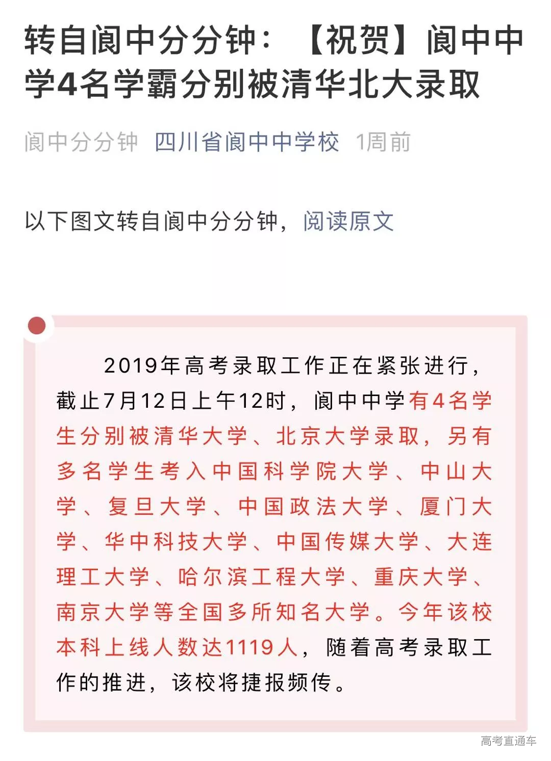 随着四川省提前批及本科一批次招生工作的结束,四川各高中也陆续公布了本校的录取成绩。 小编查阅各高中官方微信及官网,搜集了川内清华、北大录取情况。 截止7月26日,不完全统计,2019年,四川省210人考入清华、北大。其中,成都七中72人,成外23人,绵阳中学46人。 特别说明:以下数据是小编通过各校官网、官微及主流媒体等报道中搜集到的,为不完全统计。 先看总表~ 成都外国语学校 7月24日,成外官微发布文章《23人上清华北大——成外高2016级高考简报》,文章显示,2019年,成外考入清华、北大的学生有: 清华大学: 郑蘅夏、胡馨允、胡睿、向蕾陶、李巧艺、付若童、倪瑞新、黄瑞涵、邹宇涵、董瀚林、李坤应、王雨霖、吕滨睿、李斯威、谢沛君、郭鹏、贺宁怡 北京大学: 董逸飞、张雅文、邓一炜、毕盛、李思睿、孙竹筠 树德中学 7月24日,北京大学发布在川招生情况,文章显示,2019年,北京大学在川理科一批次分数线高达706分,连续9年位居全国高校榜首;文科一批次分数线为658分。 同时,文章报道了树德中学考入北大的4位学生: 吴亦晨、刘双祺、桑子洋、曾致霖 安居育才 清华大学:赵晨洋、黄煜展 北京大学:何之洲、马俊、何俊铭 绵阳外国语学校 黄文志 清华大学 棠湖中学 北京大学:付乡月 双流中学 北京大学 文星朗 广元天立学校 清华大学:赵书漾,703分,广元市理科第一名 北京大学:程云果,工科试验班类,707分,含北大“博雅计划”10分加分 简阳中学 刘星宇 北京大学 南充十中 北京大学:朱宴余,理科712分 渠县达州外国语学校 北京大学:罗欢 新都一中 北京大学:宋汶航 以下数据为民间统计: