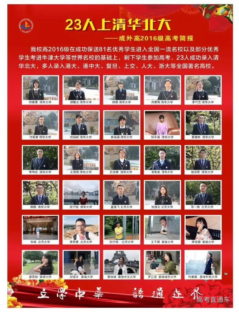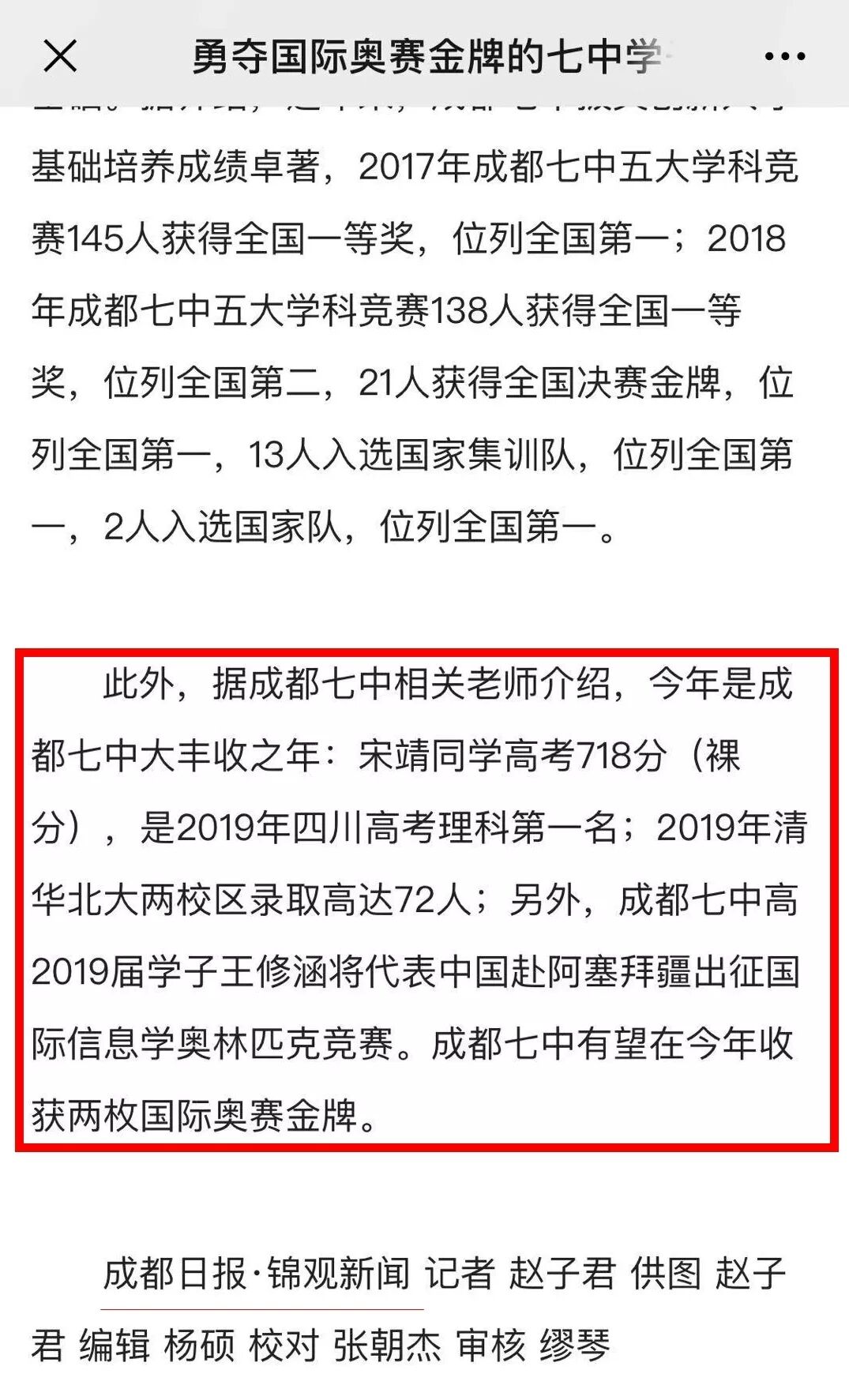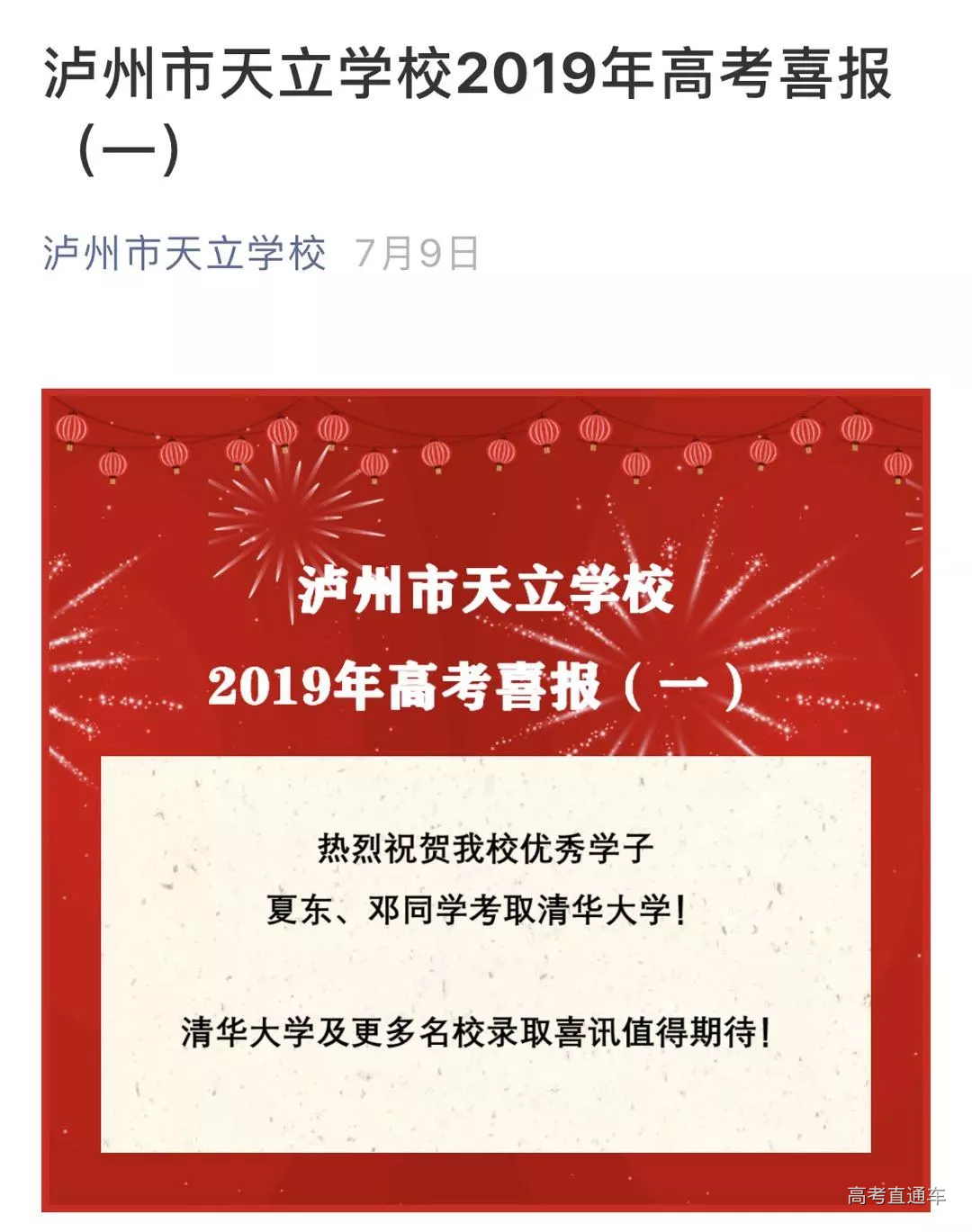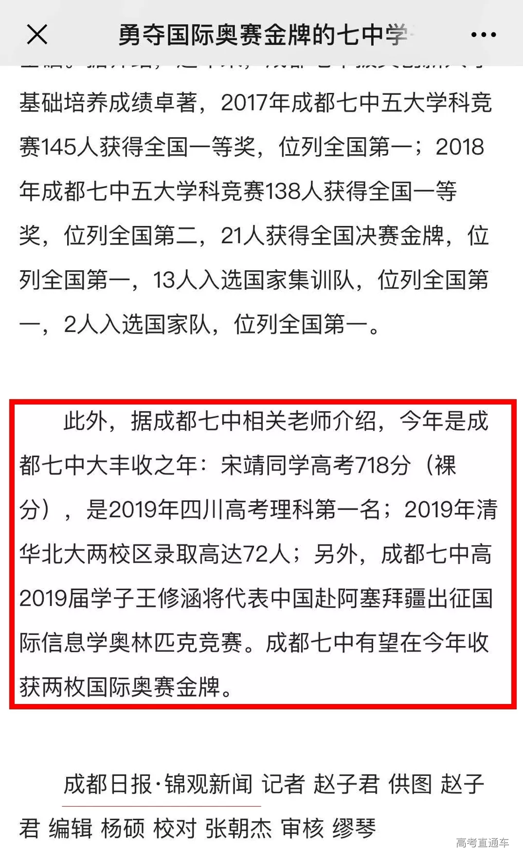随着四川省提前批及本科一批次招生工作的结束,四川各高中也陆续公布了本校的录取成绩。 小编查阅各高中官方微信及官网,搜集了川内清华、北大录取情况。 截止7月26日,不完全统计,2019年,四川省210人考入清华、北大。其中,成都七中72人,成外23人,绵阳中学46人。 特别说明:以下数据是小编通过各校官网、官微及主流媒体等报道中搜集到的,为不完全统计。 先看总表~ 成都外国语学校 7月24日,成外官微发布文章《23人上清华北大——成外高2016级高考简报》,文章显示,2019年,成外考入清华、北大的学生有: 清华大学: 郑蘅夏、胡馨允、胡睿、向蕾陶、李巧艺、付若童、倪瑞新、黄瑞涵、邹宇涵、董瀚林、李坤应、王雨霖、吕滨睿、李斯威、谢沛君、郭鹏、贺宁怡 北京大学: 董逸飞、张雅文、邓一炜、毕盛、李思睿、孙竹筠 树德中学 7月24日,北京大学发布在川招生情况,文章显示,2019年,北京大学在川理科一批次分数线高达706分,连续9年位居全国高校榜首;文科一批次分数线为658分。 同时,文章报道了树德中学考入北大的4位学生: 吴亦晨、刘双祺、桑子洋、曾致霖 安居育才 清华大学:赵晨洋、黄煜展 北京大学:何之洲、马俊、何俊铭 绵阳外国语学校 黄文志 清华大学 棠湖中学 北京大学:付乡月 双流中学 北京大学 文星朗 广元天立学校 清华大学:赵书漾,703分,广元市理科第一名 北京大学:程云果,工科试验班类,707分,含北大“博雅计划”10分加分 简阳中学 刘星宇 北京大学 南充十中 北京大学:朱宴余,理科712分 渠县达州外国语学校 北京大学:罗欢 新都一中 北京大学:宋汶航 以下数据为民间统计: