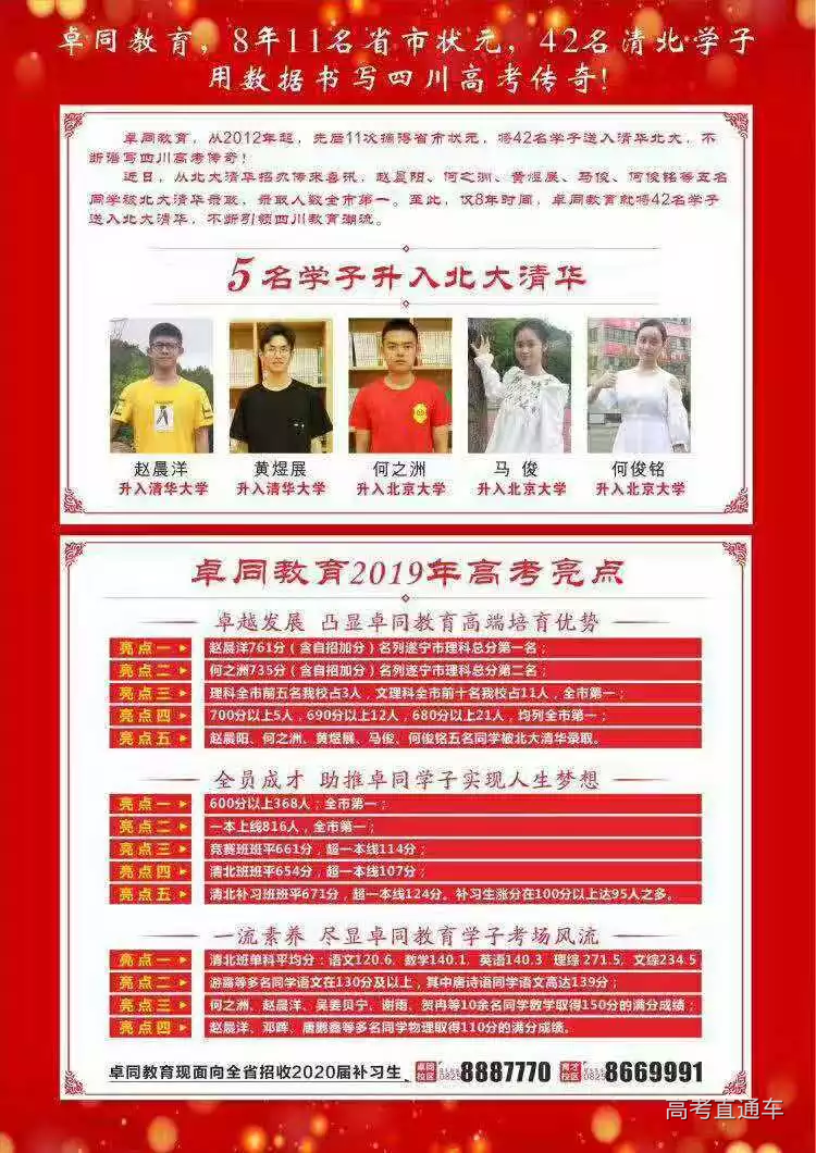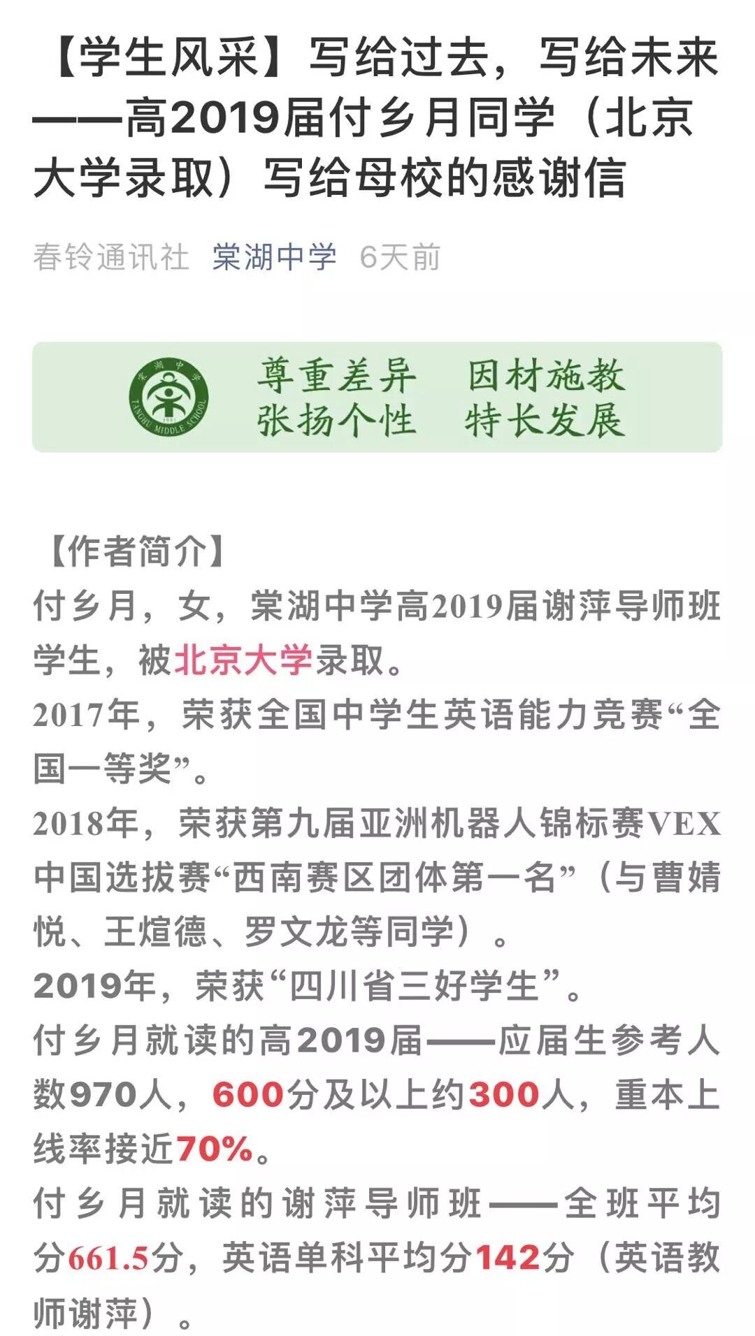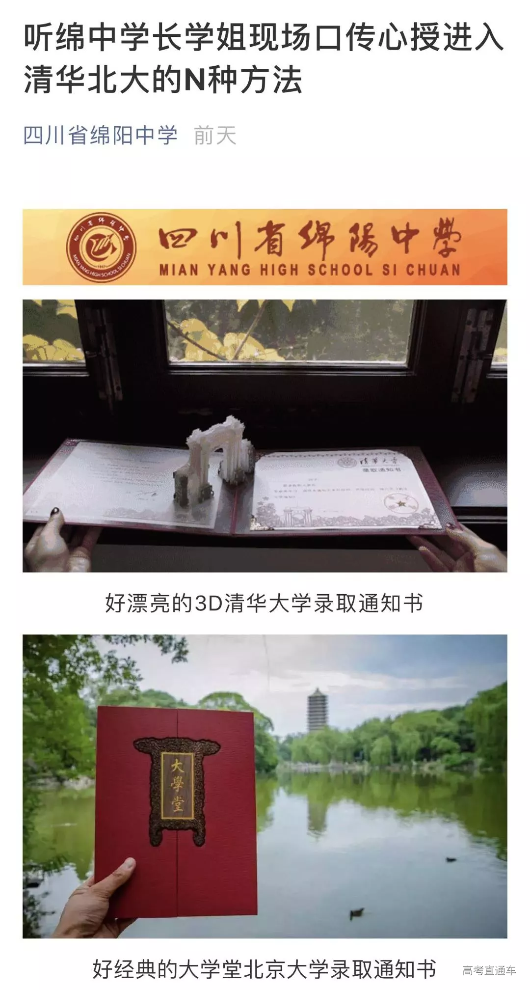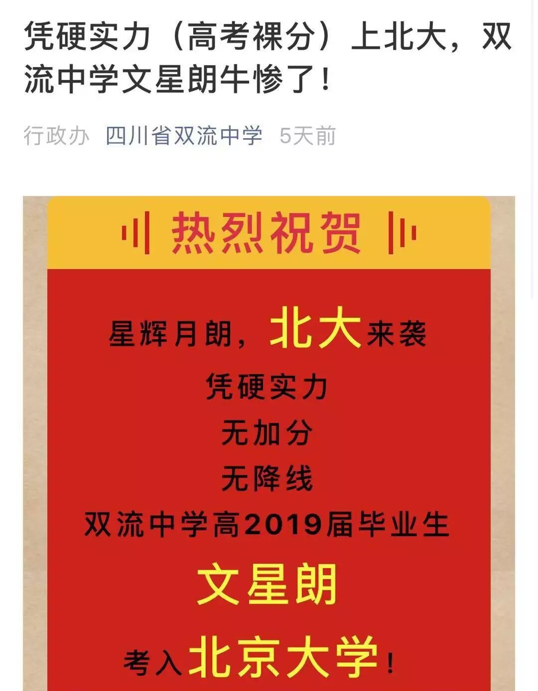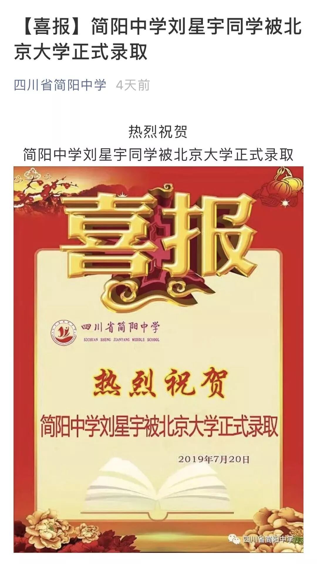随着四川省提前批及本科一批次招生工作的结束,四川各高中也陆续公布了本校的录取成绩。 小编查阅各高中官方微信及官网,搜集了川内清华、北大录取情况。 截止7月26日,不完全统计,2019年,四川省210人考入清华、北大。其中,成都七中72人,成外23人,绵阳中学46人。 特别说明:以下数据是小编通过各校官网、官微及主流媒体等报道中搜集到的,为不完全统计。 先看总表~ 成都外国语学校 7月24日,成外官微发布文章《23人上清华北大——成外高2016级高考简报》,文章显示,2019年,成外考入清华、北大的学生有: 清华大学: 郑蘅夏、胡馨允、胡睿、向蕾陶、李巧艺、付若童、倪瑞新、黄瑞涵、邹宇涵、董瀚林、李坤应、王雨霖、吕滨睿、李斯威、谢沛君、郭鹏、贺宁怡 北京大学: 董逸飞、张雅文、邓一炜、毕盛、李思睿、孙竹筠 树德中学 7月24日,北京大学发布在川招生情况,文章显示,2019年,北京大学在川理科一批次分数线高达706分,连续9年位居全国高校榜首;文科一批次分数线为658分。 同时,文章报道了树德中学考入北大的4位学生: 吴亦晨、刘双祺、桑子洋、曾致霖 安居育才 清华大学:赵晨洋、黄煜展 北京大学:何之洲、马俊、何俊铭 绵阳外国语学校 黄文志 清华大学 棠湖中学 北京大学:付乡月 双流中学 北京大学 文星朗 广元天立学校 清华大学:赵书漾,703分,广元市理科第一名 北京大学:程云果,工科试验班类,707分,含北大“博雅计划”10分加分 简阳中学 刘星宇 北京大学 南充十中 北京大学:朱宴余,理科712分 渠县达州外国语学校 北京大学:罗欢 新都一中 北京大学:宋汶航 以下数据为民间统计: