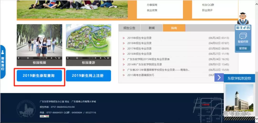 (一)、校方招生公众号后台查询 关注“广东东软学院招生就业办公室”公众号 数据还在整理中,想查询录取的考生 可稍后在公众号后台提供姓名及考生号咨询客服 (二)、广东东软学院招生网查询 广东东软学院招生网 (网址:http://zsw.nuit.edu.cn) 稍后也会开通查询通道 为已报考广东东软学院的考生提供查询 (三)微信查询方式 第一步 关注广东省教育考试院公众号 (ID:gdsksy) 第二步 进入广东省教育考试院小程序 考生关注“广东省教育考试院”微信公众号,在页面底部选择“小程序”栏,点击进入“广东省教育考试院”小程序,通过考生号和密码登录即可查询考生录取结果。 愿你在今秋时光,踏入东软征途 记录丰富的大学里程,收获美好的大学友谊!