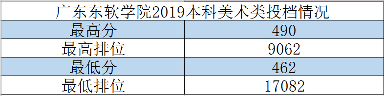 今年,广东东软学院在广东美术类统考招生计划为422人,按照省招办规定1:1投档,投档人数为422人,投档最低分为462分,高出省控线42分。