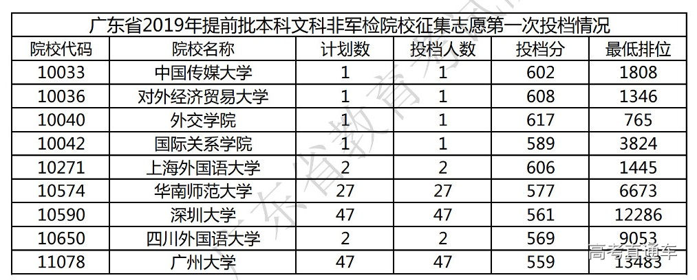 2019广东提前批本科非军检院校征集志愿第一次投档情况(文科)
