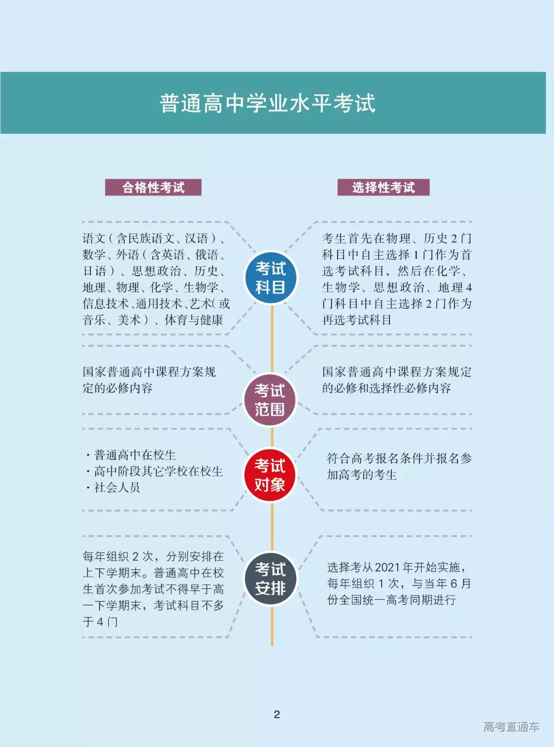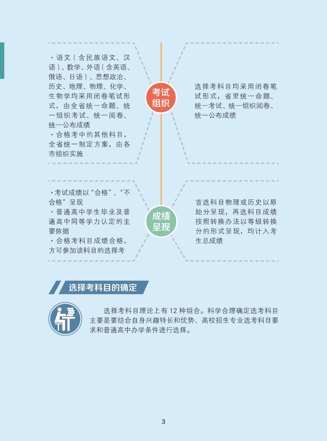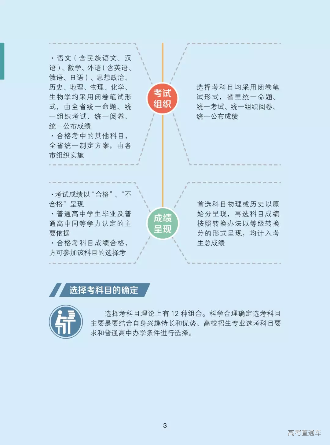 考试科目。合格性考试科目覆盖国家普通高中课程方案规定的所有科目;选择性考试科目包括物理、化学、生物学、思想政治、历史、地理,考生以高校专业选科要求等为主要依据,选择其中3门