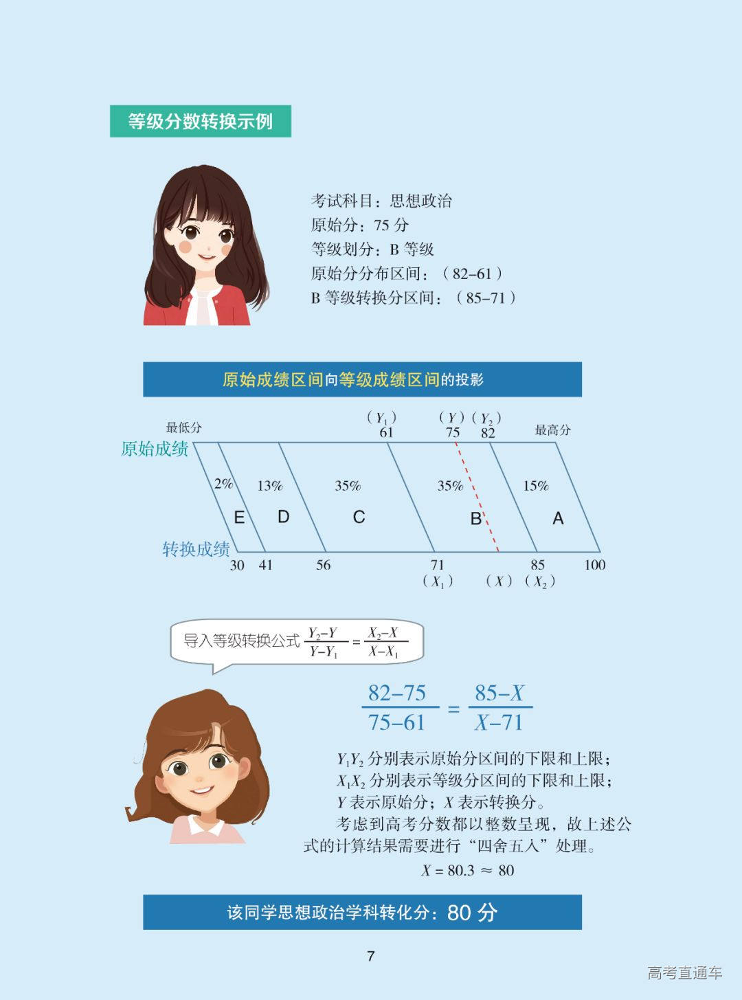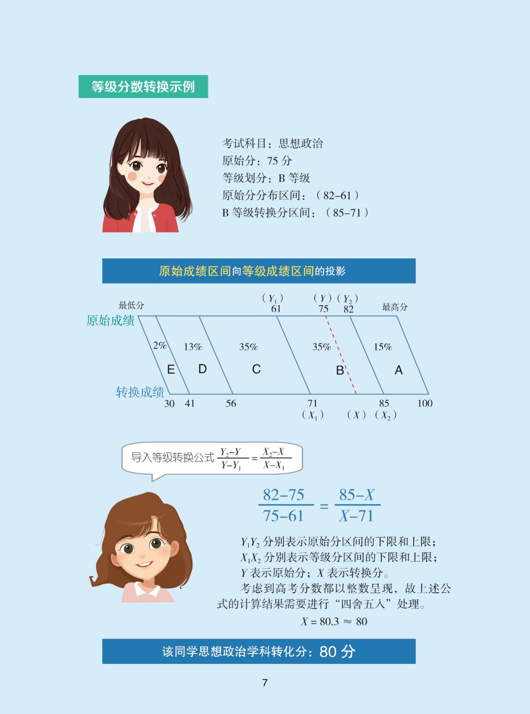 选择性考试再选科目的赋分规则。每科原始分为100分,转换时以30分作为等级转换的赋分起点,满分100分。将考生每门选择性考试再选科目的原始分从高到低划分为A、B、C、D、E共5个等级,各等级人数所占比例分别约为15%、35%、35%、13%和2%,转换基数为实际参加该选择性考试科目的人数。选择性考试再选科目成绩计入考生总成绩时,将A至E等级内的考生原始成绩,依照等比例转换法则,分别转换到100~86、85~71、70~56、55~41和40~30五个分数区间,根据线性转换公式计算得到考生的等级分,一分一档,考生等级分排序和原始分排序不变。