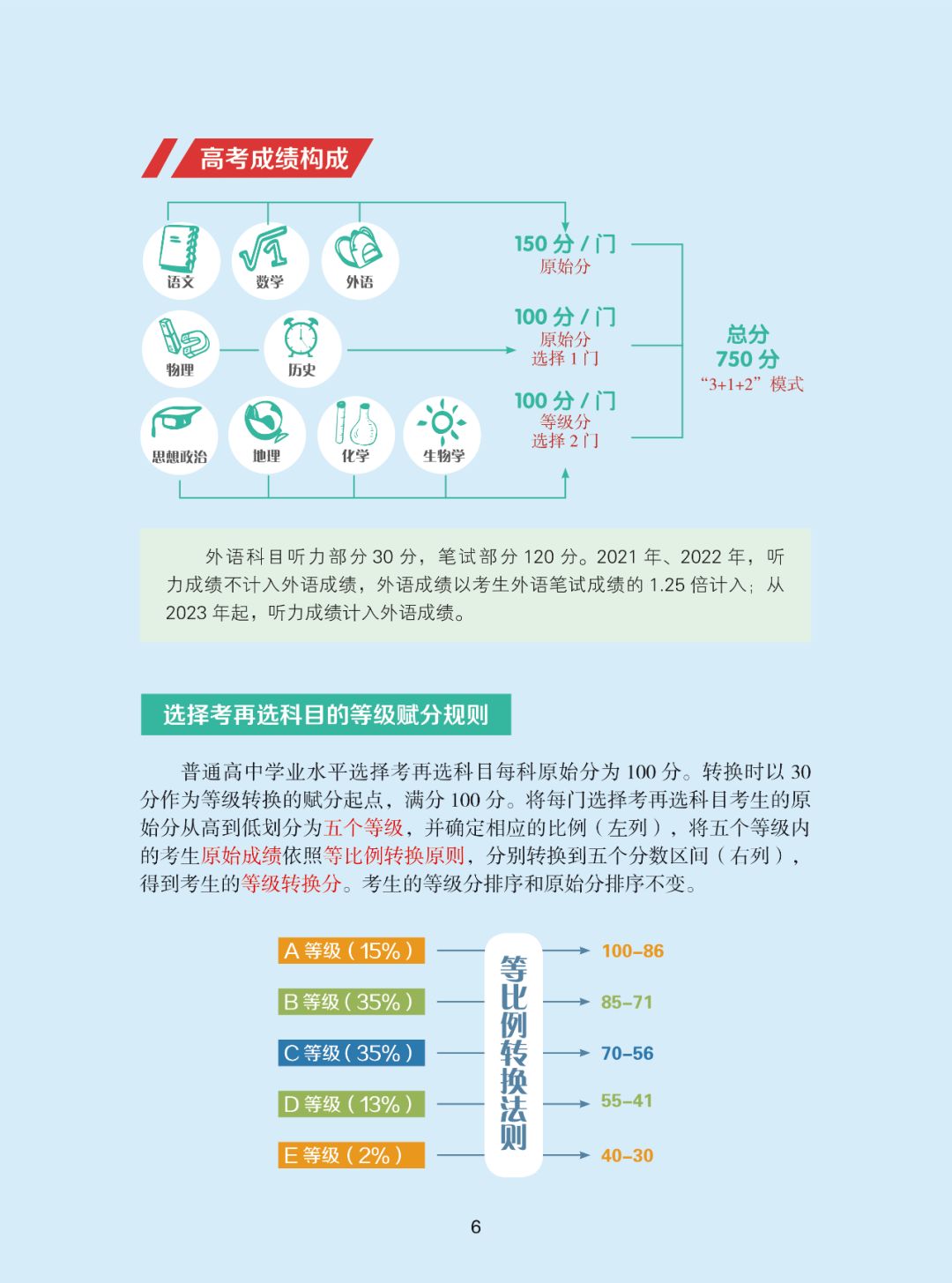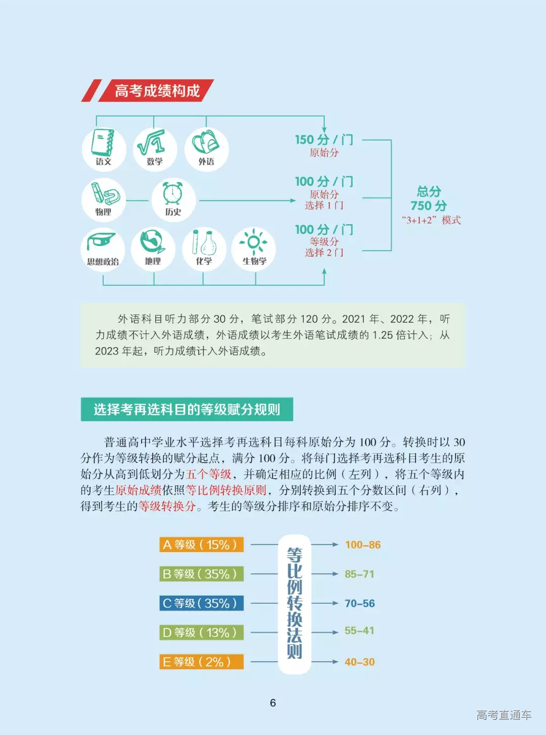高考成绩构成。考生总成绩由统一高考的语文、数学、外语成绩和选择性考试科目成绩构成,总分为750分。其中:语文和数学以原始分计入总成绩,满分均为150分。外语科目满分150分,其中听力部分30分,笔试部分120分。2021年、2022年,听力成绩不计入外语成绩,外语成绩以考生外语笔试成绩的1.25倍计入;从2023年起,听力成绩计入外语成绩。选择性考试科目中物理、历史2门首选科目以原始分,化学、生物学、思想政治、地理4门再选科目以等级分分别计入总成绩,各科满分均为100分。选择性考试成绩当年有效。