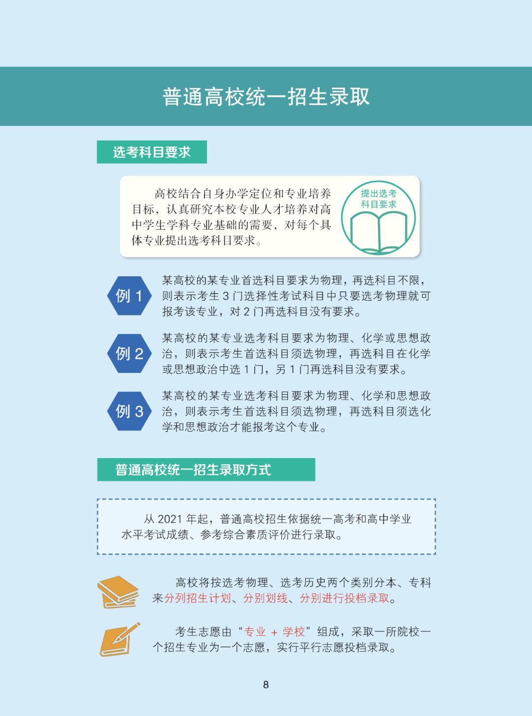 改进招生录取方式。高考成绩公布后填报志愿,考生志愿由“专业+学校”组成,实行平行志愿投档,依据考生首选物理或历史科目的不同,分别划定最低录取分数线,分别投档录取。