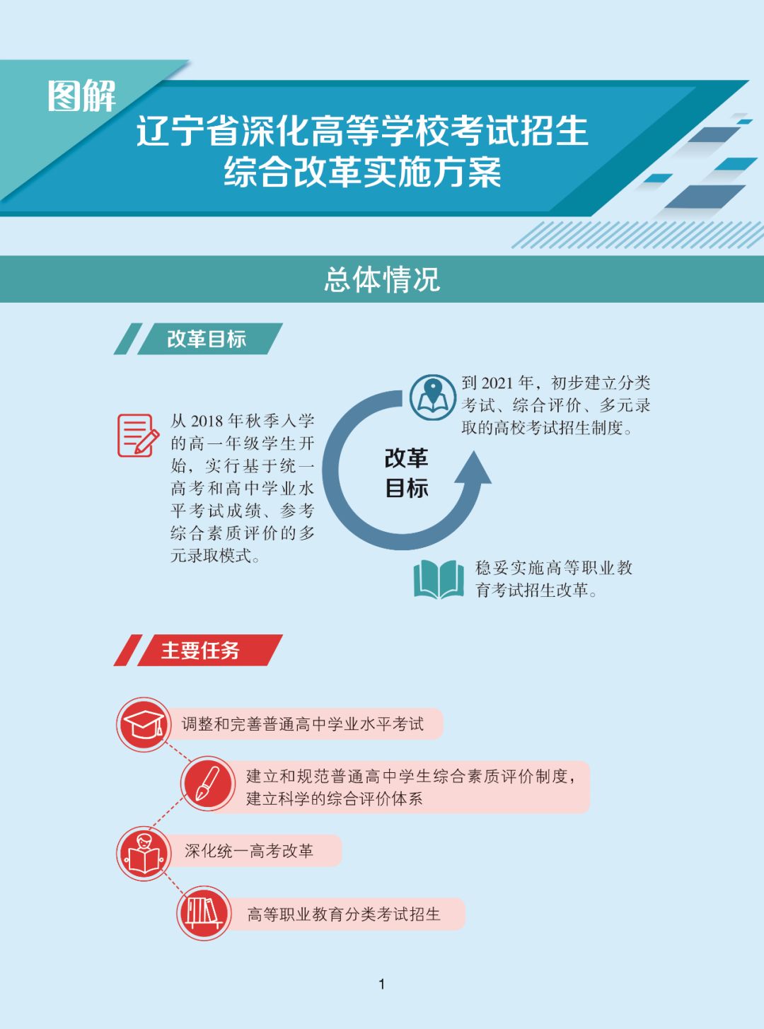 辽宁省高考综合改革从2018年秋季入学的高一年级学生开始实施,实行基于统一高考和高中学业水平考试成绩、参考综合素质评价的多元录取模式;稳妥实施高等职业教育考试招生改革。到2021年,初步建立分类考试、综合评价、多元录取的高校考试招生制度。
