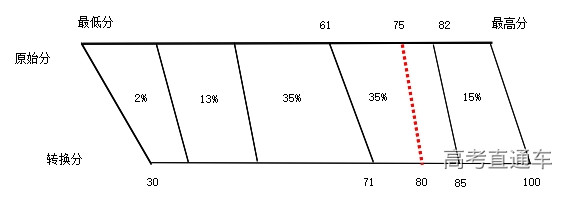 第一步,将该科目考生卷面原始分从高到低依次按照15%、35%、35%、13%和2%的比例划分为A、B、C、D、E共5个等级,考生的原始分转换成等级。缺考、零分考生人数不计入转换基数,违规或作弊考生计入转换基数,但转换后的成绩按零分计。