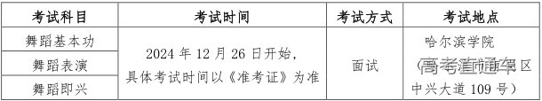 艺术类专业省级统考面试设黑龙江大学、哈尔滨师范大学、哈尔滨音乐学院、哈尔滨学院等4个考点,其中黑龙江大学负责播音与主持类面试组考工作,哈尔滨师范大学负责表(导)演类面试组考工作,哈尔滨音乐学院负责音乐类面试组考工作,哈尔滨学院负责舞蹈类面试组考工作。