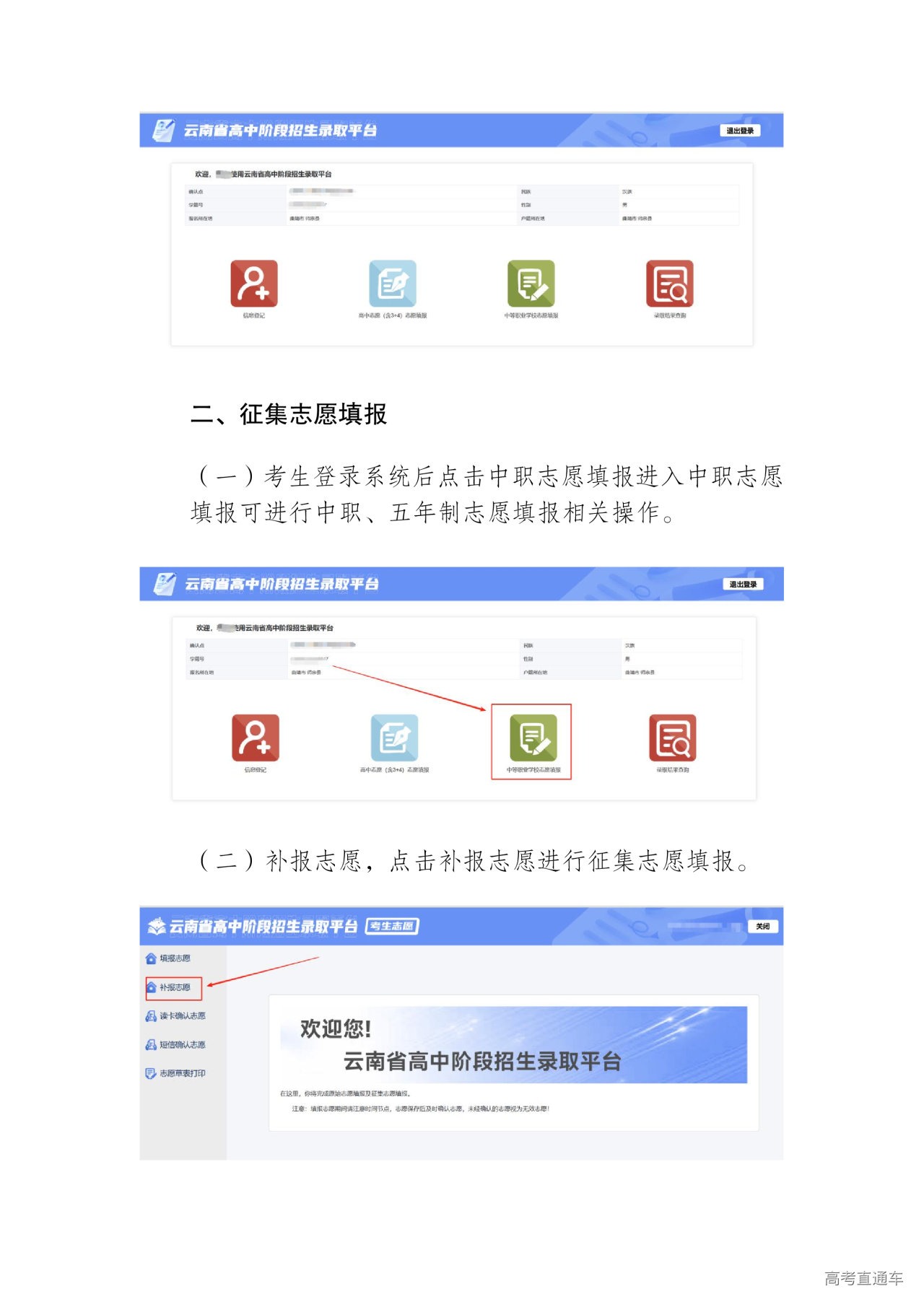 (一)符合征集条件的考生,登录“云南省高中阶段招生录取平台”https://gzzsgl.ynzs.cn/login,参加征集志愿。在登录页面,考生使用考籍号(初中学业水平考试考号)+用户密码登录系统(考生如忘记登录密码,请联系原报名确认点或通过短信验证码找回密码),点击“中等职业学校志愿填报”,选择“考生补报志愿”,进行征集志愿填报。填报完毕点击“保存”后,考生可到原报名学校或初中学校所在县、市、区招生考试机构确认志愿,并打印《确认表》签字;也可以通过短信验证码确认志愿;或登录考生个人账号,使用二代身份证阅读器刷卡确认。考生要特别注意,未经确认的志愿无效。