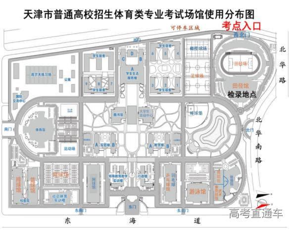 天津体育学院新校区(静海区团泊新城西区东海道16号)。考试当天,考生须从学校西北门进入考点