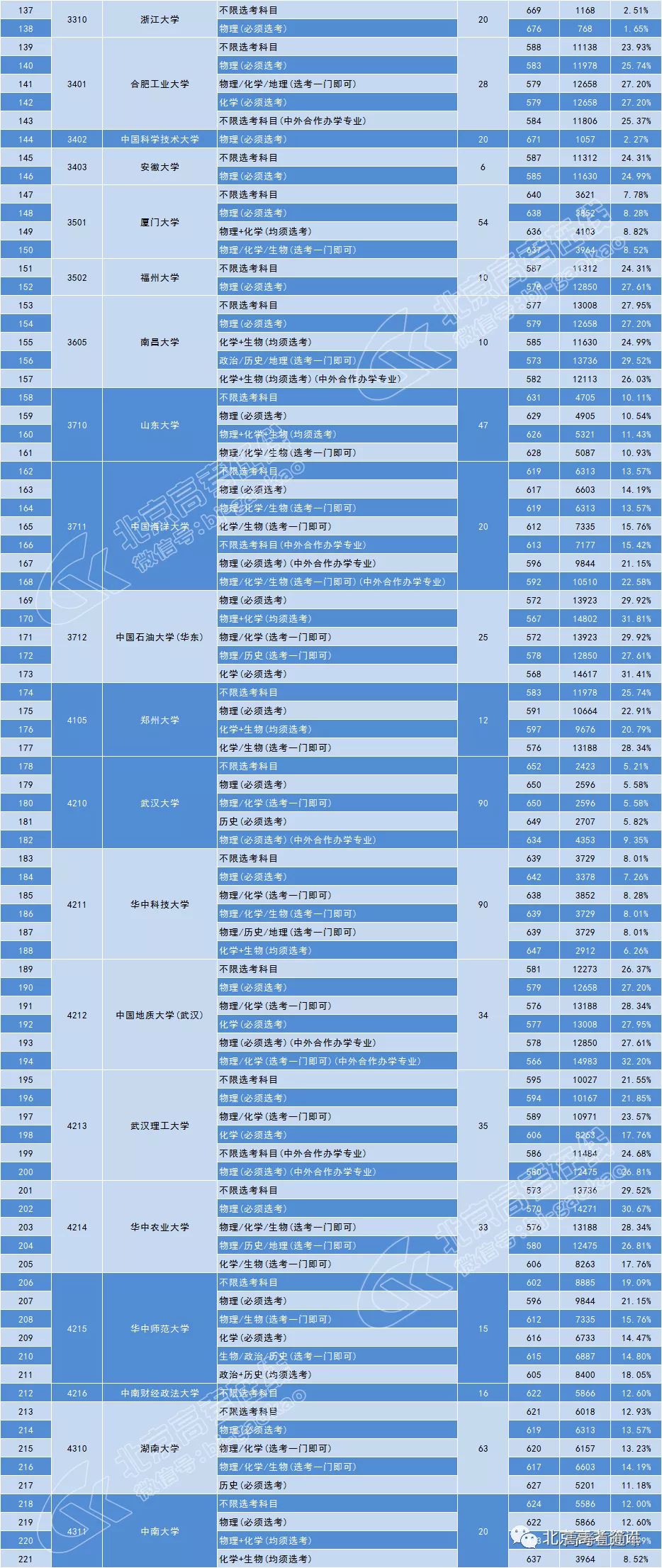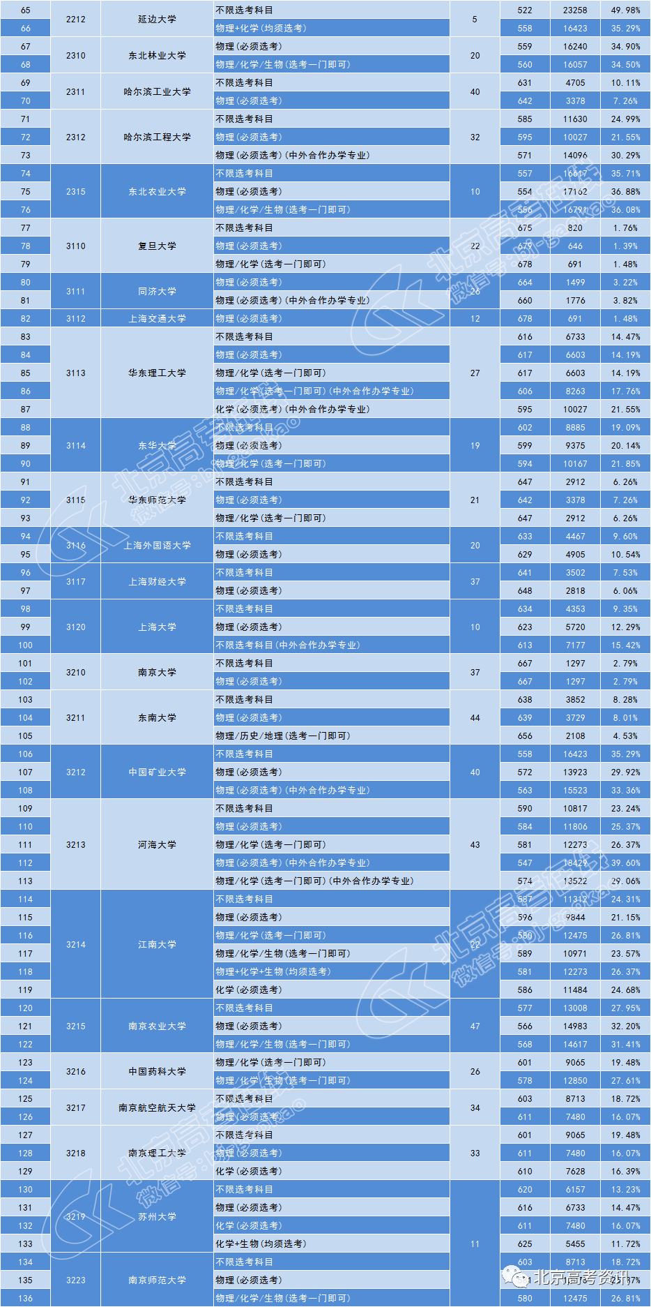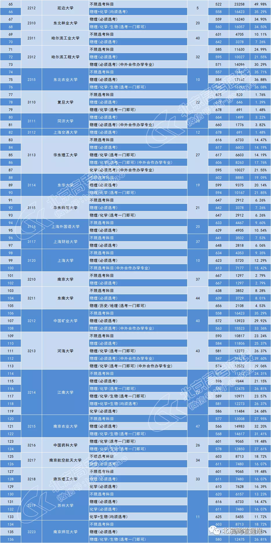 3、中科大、南大、同济、南开、天大、东大这几所学校的部分专业组位次排名在5%,均为985重点高校。与人大、北航、北师、北理、对外经贸不相上下。