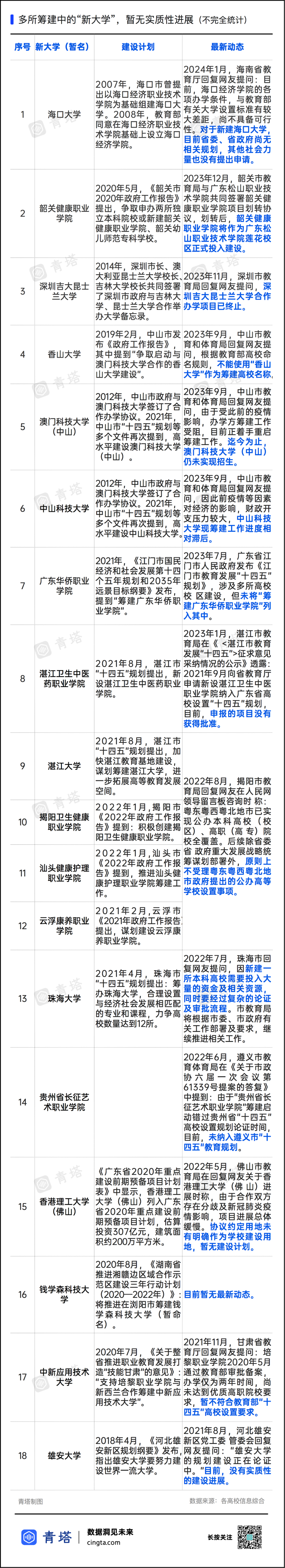这也意味着,赣州工业信息职业学院的建设,或将暂停推进。筹建新大学,有跃跃欲试,就会有偃旗息鼓。这所学校并不是特例,新大学不建了的事情其实总有发生。2023年末,广东韶关市教育局做出了决定,停止建设总投资6亿多元,占地面积约524亩的韶关健康职业学院,将该校正在施工的23栋建筑已完成21栋封顶的校区划转给广东松山职业技术学院。接力建设的松山职院将全力加快项目施工建设进度,力争今年9月让首批2000名师生入驻。巧合的是,就在签约的第二天,人民网领导留言板上出现了一则关于广东省揭阳市惠来大学城建设的建议,询问市里有无加大引进高等大学的计划。随后揭阳市粤东新城管委会在回复中提到,根据全省高等教育布局调整优化方向和该市的经济基础以及区域发展实际,该市短期内新设普通高校存在较大的政策瓶颈。 2021年,教育部在《关于“十四五”时期高等学校设置工作的意见》中强调,“以高质量发展为主线,从严控制设置数量……编制‘十四五’时期高校设置规划,未纳入规划的高校设置事项原则上不受理申报。”此后广东省相关部门明确,粤东粤西粤北地市已实现公办本科高校(校区)、高职(高专)院校全覆盖,后续除省委省政府重大发展战略统筹谋划部署外,原则上不受理粤东粤西粤北地市政府提出的公办高等学校设置事项。这也是韶关市和揭阳市两个位于粤北粤东的地区,暂时难以新建高校的原因。指挥棒在前,跟上脚步的省份不只广东。黑龙江、山东、山西、河南等省份均在“十四五”高校设置规划中明确,严格控制设置数量,原则上不再增设新的普通高等学校。政策限制,以及其他诸如经济投资、布局规划等因素影响下,许多筹建中的新大学,陷入了重重迷雾中。人越来越少了。“学生数量下降,但是大学数量过多”,是全世界高等教育正在述说的通用叙事。