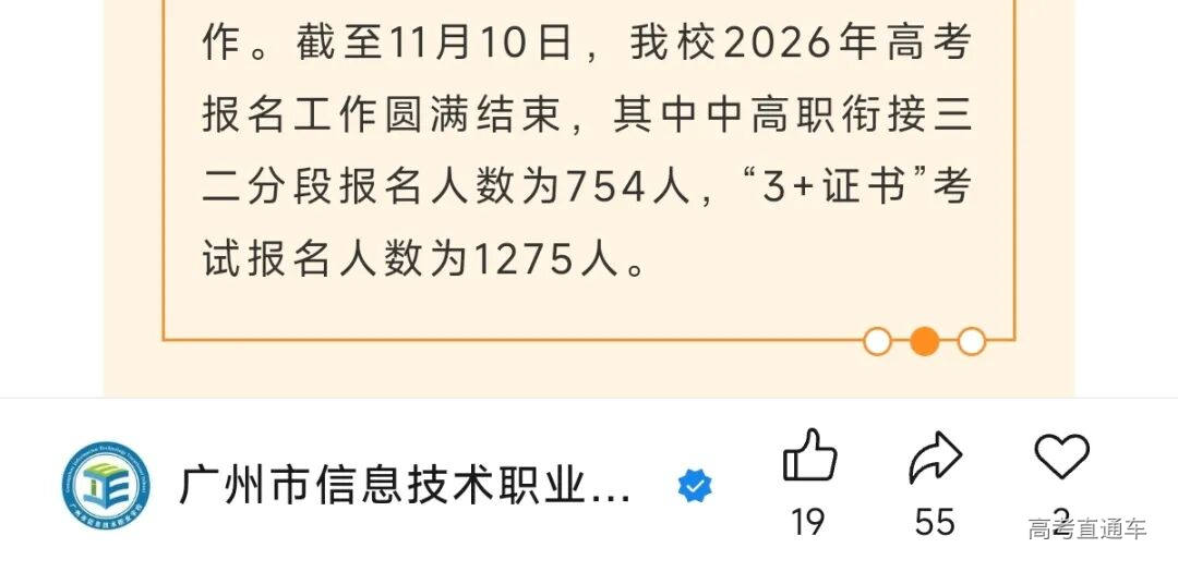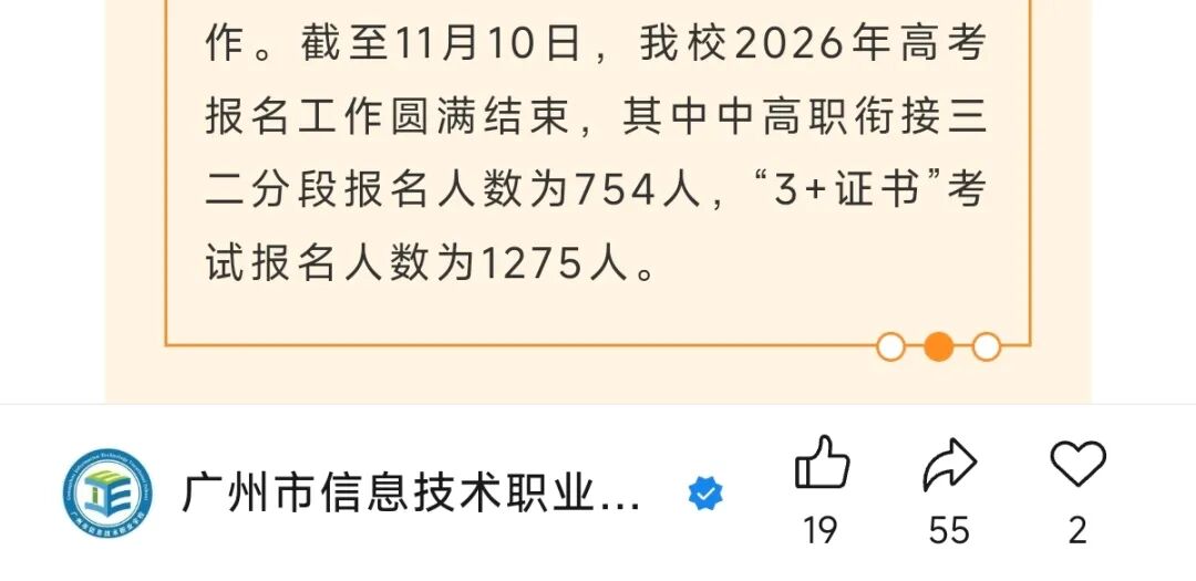据学校官微消息,学校2026年高考报名工作圆满结束,其中中高职衔接三二分段报名人数为754人,“3+证书”考试报名人数为1275人。