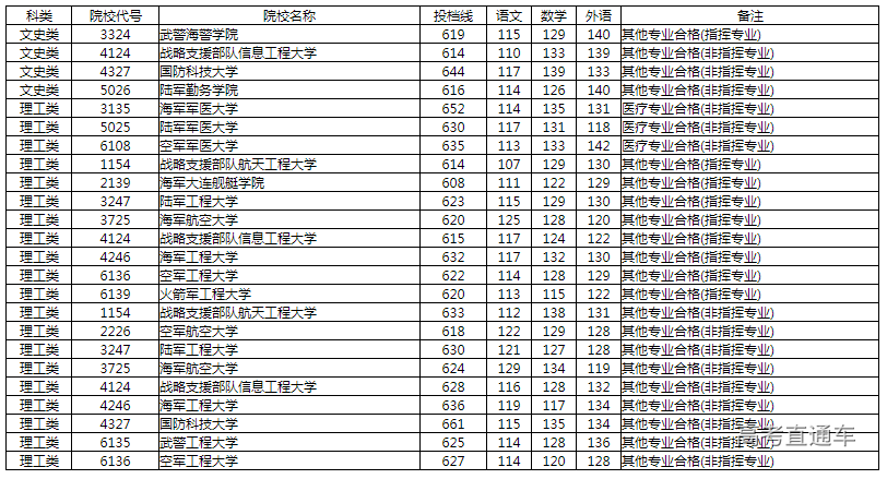 说明:●● 1、平行志愿投档的规则:在军检合格的上线考生中,先按分数优先的原则从高分到低分排序(当遇到多名考生同分时,分别按语、数、外三科成绩从高分到低分排序),再按考生填报的学校顺序出档。表中所列语文、数学、外语分数是档案分与投档分数线相同的最后一名出档考生的成绩。 2、部属和外省属院校投档时,档案分中不含考生地方性项目加分。