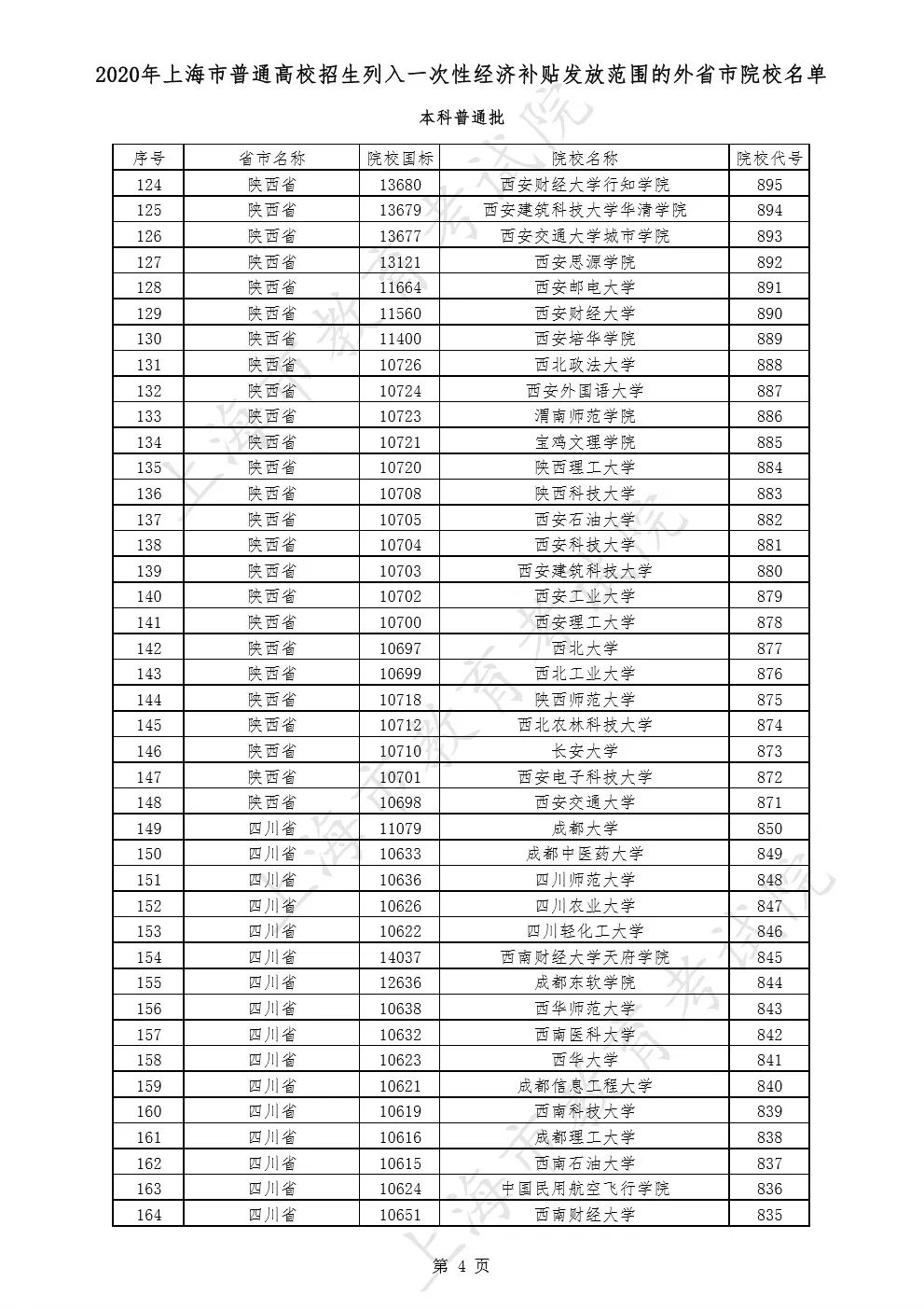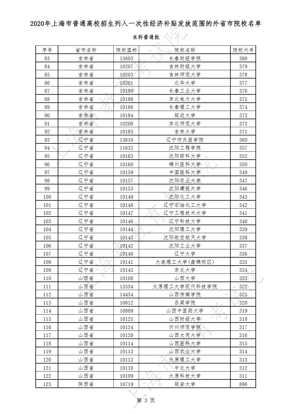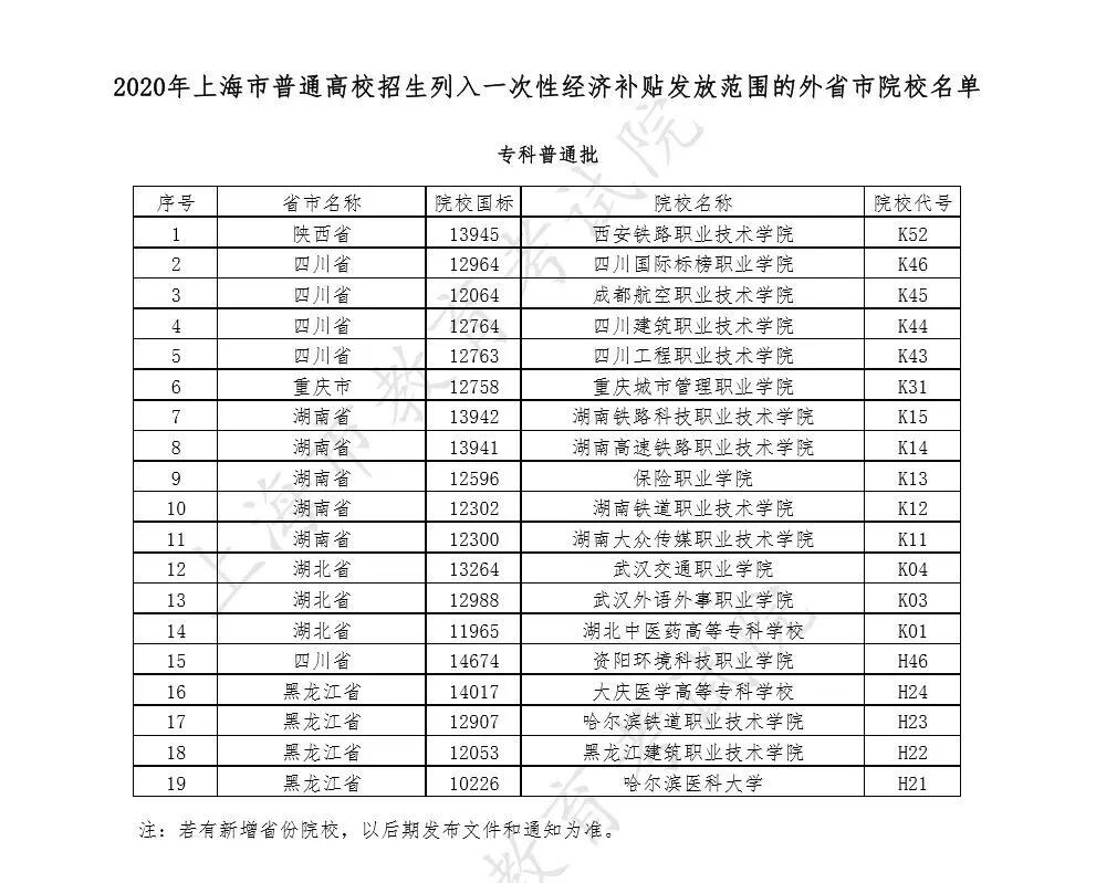 2020年上海市普通高校招生列入一次性经济补贴发放范围的外省市院校名单