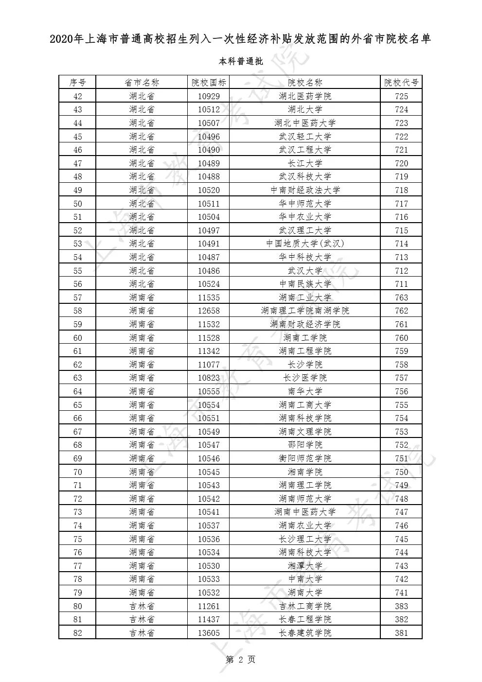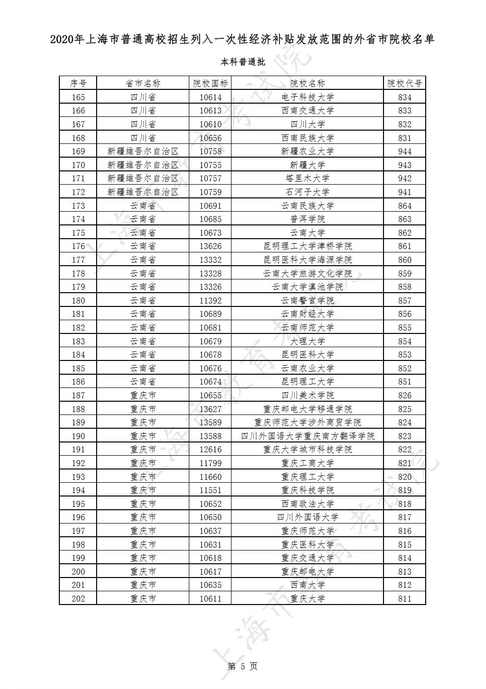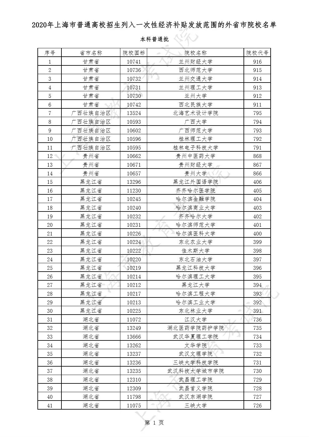 2020年上海市普通高校招生列入一次性经济补贴发放范围的外省市院校名单