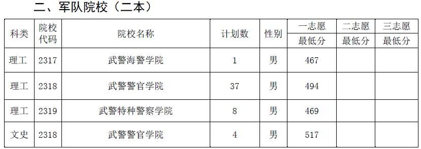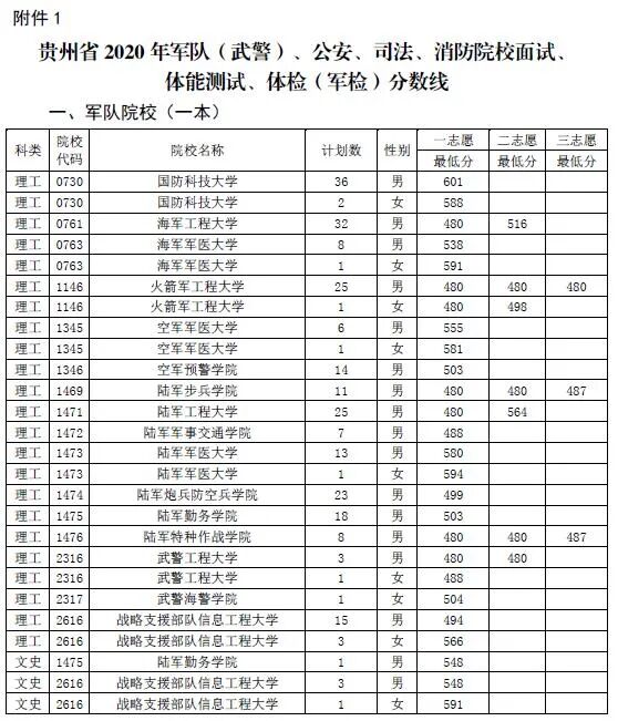 各市(州)招生委员会、招生考试机构,各县(市、区、特区)招生委员会、招生办:为确保军队(武警)、公安、司法、消防院校提前批次招生面试、体检(军检)和体能测评工作的顺利进行,现将有关事项通知如下:1.时间:8 月 2 日下午至 8 月 5 日上午①8月2日下午。14:00 开始,17:30 时结束,对贵阳市(含贵安新区)、安顺市、遵义市考生进行面试;②8月3日全天。上午 07:30 开始,11:30 结束,下午 14:30分开始,17:30 分结束,对毕节市、铜仁市、六盘水市考生进行面试,上午参加面试考生需空腹,视情参加 8月3日上午体格检查;③8月4日全天。上午 07:30 开始,11:30 结束,下午 14:30分开始,17:30 分结束,对黔南州、黔东南州、黔西南州考生进行面试,上午参加面试考生需空腹,视情参加 8月4日上午体格检查;④8月5日上午。07:30 开始,11:00 结束,对还未参加面试的各市(州)考生进行面试,参加面试考生需空腹。2.地点:中国人民解放军联勤保障部队第九二五医院(原中国人民解放军第四十四医院,以下简称九二五医院,地址为贵阳市花溪区黄河路67 号)(体检必须空腹)。(二)中国人民公安大学、中国刑事警察学院、铁道警察学院、南京森林警察学院、贵州警察学院(提前批次公安院校公安类专业)的面试、体能测评1.时间:8月2日—8月4日(上午8:30—12:00,下午14:00—17:00)2.地点:贵州警察学院北区综合楼(贵阳市南明区见龙洞路132号)(三)中央司法警官学院、浙江警官职业学院的面试、体能测试1.时间:①中央司法警官学院,2020年8月7日上午8:00-12:00。②浙江警官职业学院,2020年8月8日上午8:00-12:00。2.面试、体能测试、体检地点:贵州省司法警官学校(贵阳市花溪区松花江路37号)。(四)中国消防救援学院的政治考核、体格检查、心理测试、面试1.报到时间:8月1日18:00前;地点:贵州省消防总队(贵阳市沙冲南路198号)2.体检时间8月2日7:30,地点(电话、短信通知);3.心理测试时间:8月2日14:00;面试时间8月3日8:00。心理测试、面试地点:贵州消防总队训练与战勤保障支队(贵阳市白云区金园路1号原贵州消防学校)。(一)按照《贵州省招生委员会 贵州省军区战备建设局关于做好2020年军队院校招收普通高中毕业生工作的通知》规定的比例,划定面试和体检人员分数线,并组织上线考生参加面试、体检。(二)按照公安部、教育部等相关文件的要求,中国人民公安大学、中国刑事警察学院、铁道警察学院、南京森林警察学院、贵州警察学院按照招生计划的5倍比例划定面试和体检人员分数线,并组织上线考生参加面试、体能测评。其中,铁道警察学院(专科层次招生)采取二本线上填报志愿考生不划比例,均参加面试,二本线下(专科线上)考生按照招生计划数5倍比例划定面试和体检人员分数线,并组织上线考生参加面试、体能测评。(三)中央司法警官学院按照招生计划数5倍比例划定面试和体检人员分数线,并组织上线考生参加面试、体能测评。浙江警官职业学院采取二本线上填报志愿考生不划比例,均参加面试,二本线下(专科线上)考生按照招生计划数5倍划定面试和体检人员分数线,并组织上线考生参加面试、体能测评。中国消防救援学院按照招生计划数4倍比例划定面试人员分数线。(一)各级招生办要根据军队(武警)、公安、司法、消防院校面试名单,及时通知辖区所有符合条件的考生参加面试、体检(军检)和体能测试,并做好工作记录。(二)达到提前批次军队院校面试分数线并接到通知的考生参加面试、体检需携带准考证、身份证、政治考核表、2020年贵州省报考军队院校考生健康承诺书和本人近期1寸白底免冠照片(2张)。考生14天以内有疫情中高风险地区活动史,出现过发热、咳嗽等症状,健康码扫码非绿色,或面试体检当日体温超过37.3℃,需持3日内核酸检测报告,于8月5日统一到第九二五医院进行面试、体检;考生参加面试、体检期间,必须全程佩戴口罩,不得私自摘下,做到听招呼、守规矩,违反规定且情节严重的考生取消面试、体检资格;因疫情防控工作需要,除家长代表外,陪同考生的家长不得进入面试、体检等工作场所,不得在检录、面试、体检现场外围扎堆逗留,不得将车辆停放在医院内;考生在检录处出示健康码后,将手机交予陪同家长,不得带入面试、体检现场,若无家长陪同,则集中存放在检录点旁手机柜内。达到提前批次公安、司法院校面试分数线并接到通知的考生根据疫情防控需要,参加体检、体能测评、面试的考生,到达面试现场后需扫描“贵州健康码”同时进行体温检测,“贵州健康码”显示为“绿色”且体温低于37.3℃者,方能参加体检、体能测评、面试;体检前14天内有中高风险地区旅居史或“贵州健康码”显示为“黄色”或“红色”的,考生需提供体检前7天内的有效核酸检测阴性报告,体检当天体温检测达到37.3℃及以上的,体检现场考生须服从工作人员疫情防控工作安排。(三)未按规定时间参加面试、体检(军检)和体能测试的考生,按自愿放弃志愿处理。 以往文件中规定的面试、体检(军检)和体能测评等时间与本通知不相符的以本通知为准。 附件:1.贵州省2020年军队(武警)、公安、司法、消防院校面试、体能测试、体检(军检)分数线 2.《2020年贵州省报考军队院校考生健康承诺书》