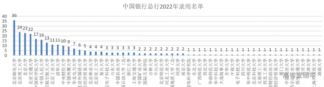 9月15日,中国银行总行公布了2022年拟录用的283名应届毕业生名单,其中北邮有36人被录取毫无意外地排在首位,这已经是北邮连续三年排名第一,而北理录用人数则不断上升,今年更是超过了北大排在了第二名,表现非常亮眼。