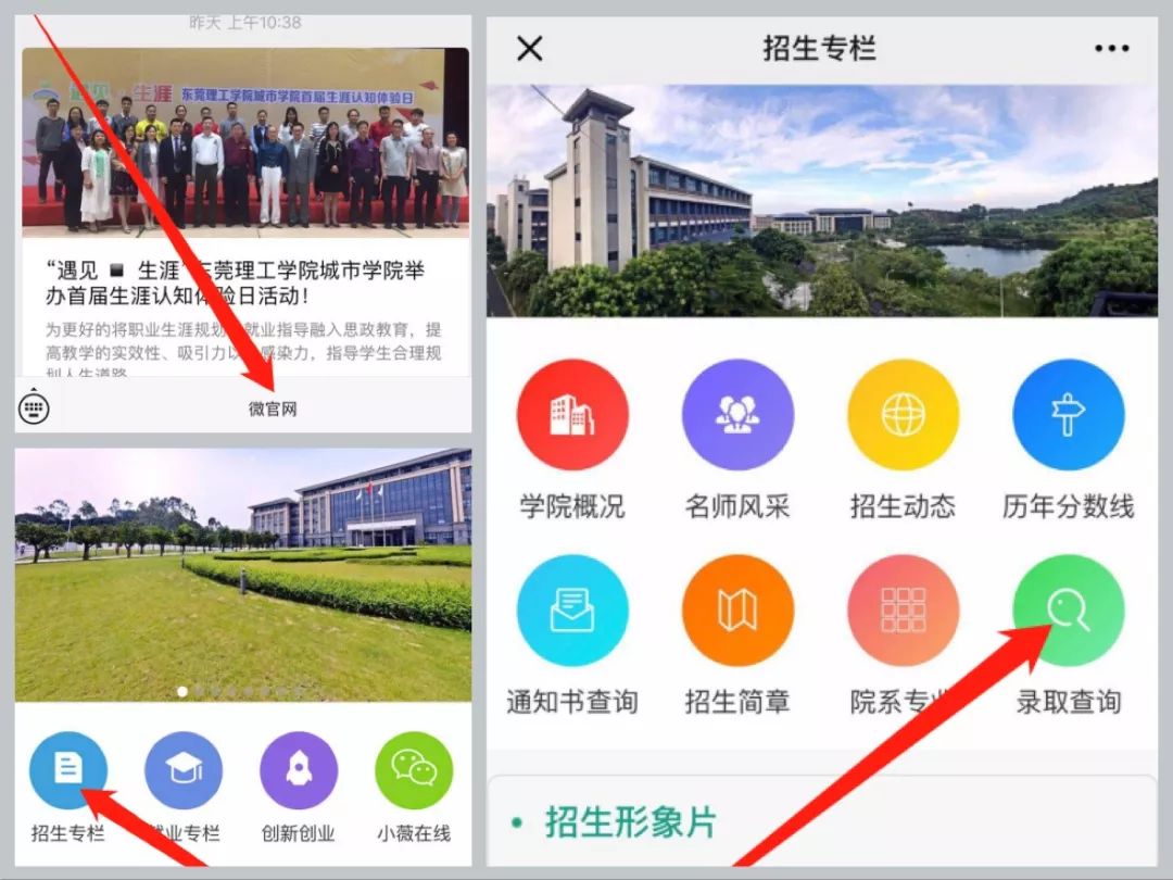 进入城市学院招生就业处微信公众平台→点击微官网→招生专栏→录取查询