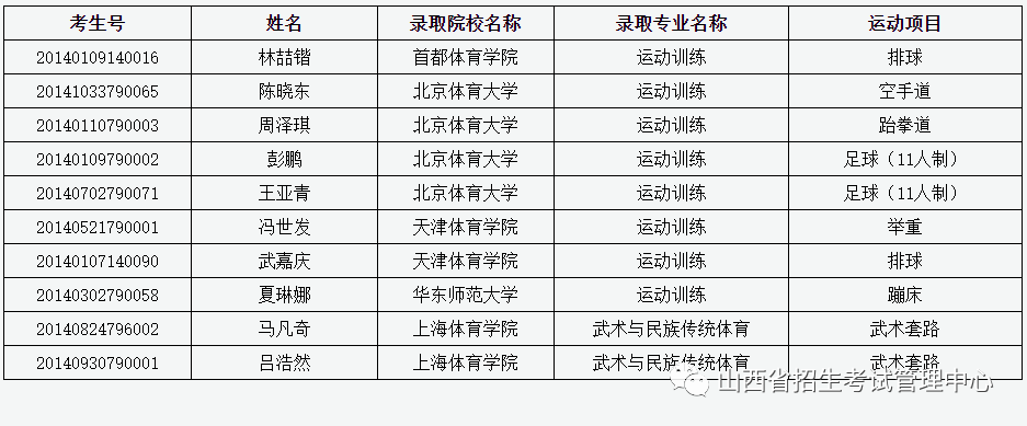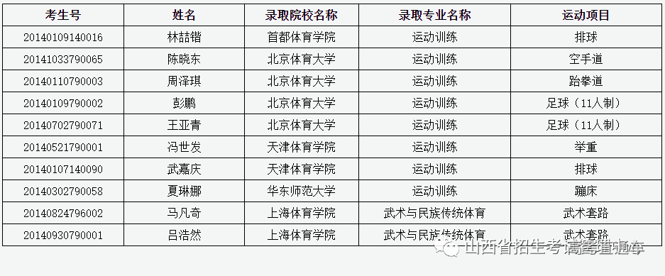 山西省2020年普通高校招生高水平运动员保送录取名单