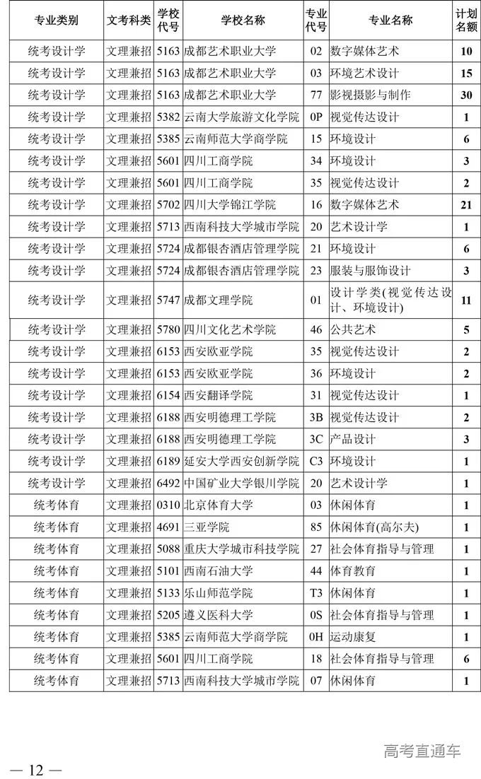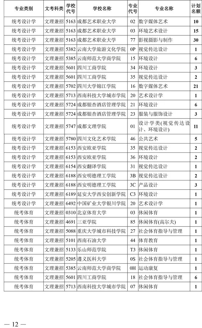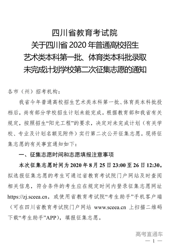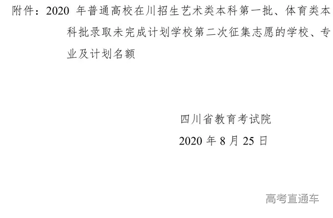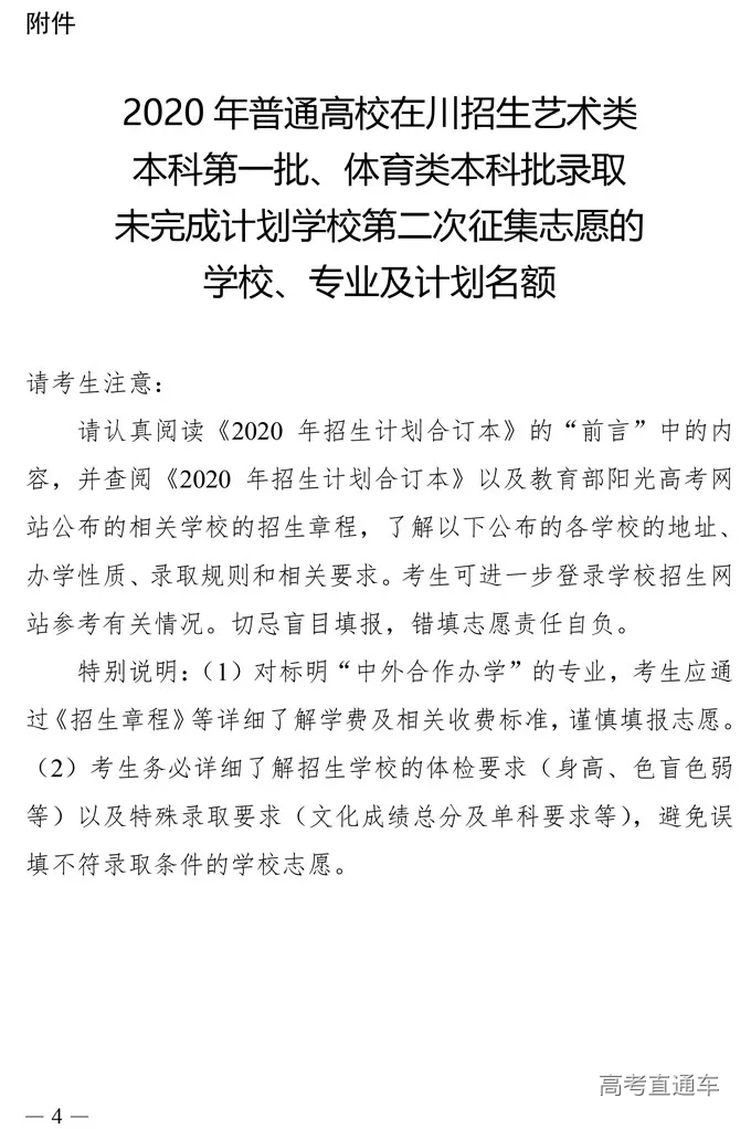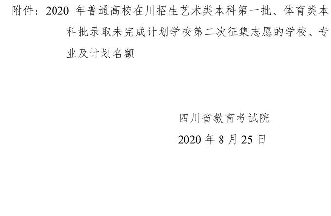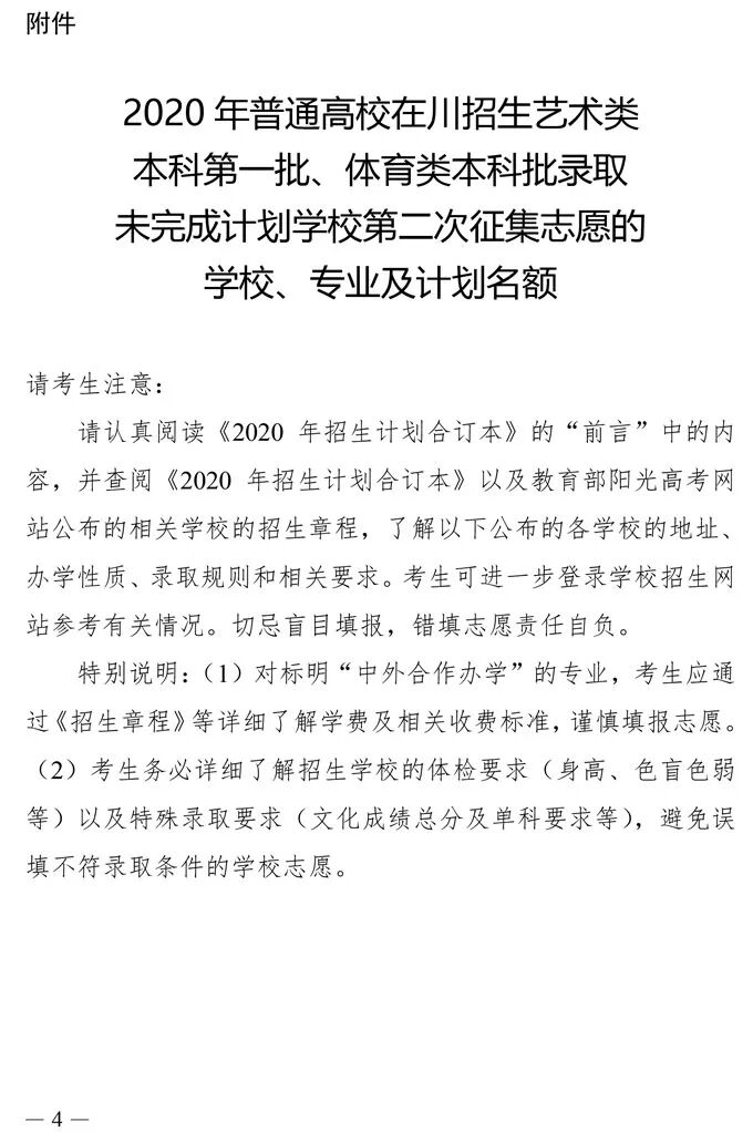 四川省2020高考艺术类本科第一批、体育类本科批录取未完成计划学校第二次征集志愿的通知