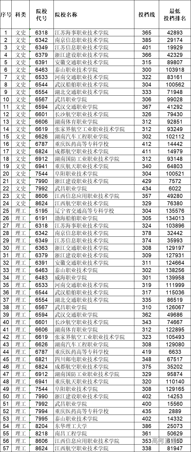 (二)普通文理提前批高职(专科)统招类院校单志愿投档后,投档分数居前的院校为: