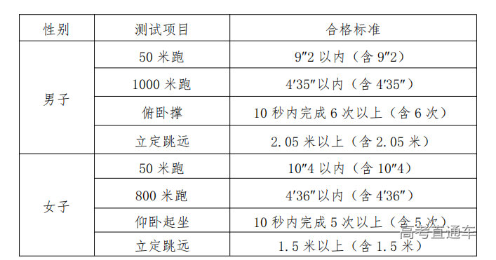 以下四个项目中须有三项达标,体能测试结论方为合格。(如遇异常天气导致测试项目有变动,学院将另行通知)