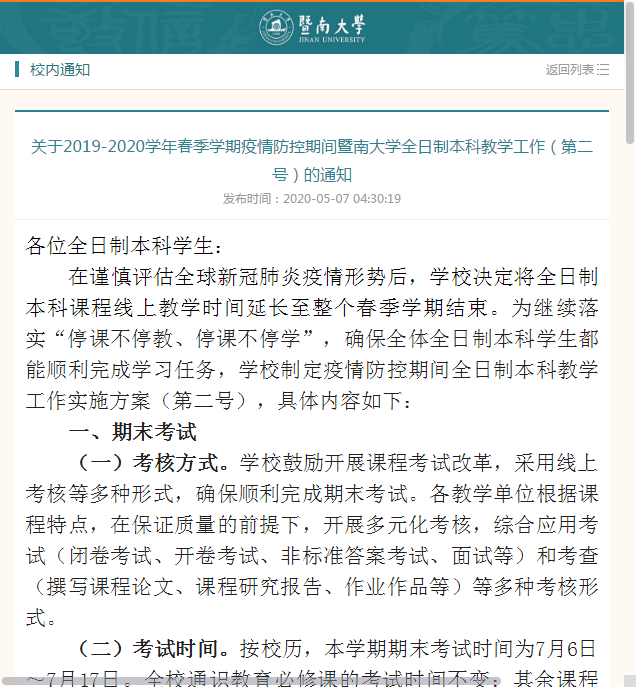 5月7日,暨南大学教务处发布《关于2019-2020学年春季学期疫情防控期间暨南大学全日制本科教学工作(第二号)的通知》。通知表示,在谨慎评估全球新冠肺炎疫情形势后,学校决定将全日制本科课程线上教学时间延长至整个春季学期结束。通知全文如下
