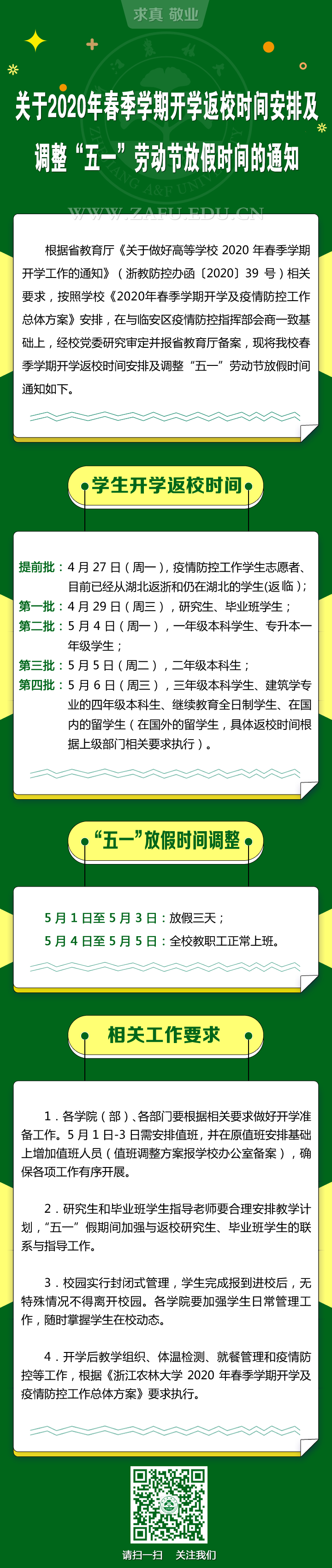 各学院(部)、各部门要根据相关要求做好开学准备工作。希望同学们不折不扣地遵守防控要求,不提前返校,在防控常态化背景下养成和坚守健康的生活方式、学习方式、饮食方式。让我们勠力同心,共同确保师生顺利返岗返学。