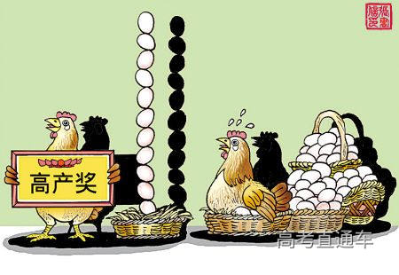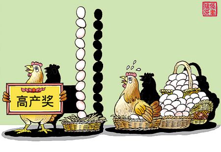 【文题解析】:①漫话的标题是《巧干活》。漫画由两部分构成。左边的一部分一只手拿“高产奖”奖牌的母鸡,头高高的昂起,眼睛微闭,一副得意忘形、趾高气扬的表情,身边是它的产品:在一鸡窝里,10个鸡蛋立着垒起来,摇摇欲坠,右边的一部分,一只母鸡蹲在鸡窝上,鸡窝里只有半窝蛋。而旁边还有满满三筐蛋,可是高度没有左边那只母鸡的鸡蛋高。它正惊疑地看着左边的母鸡:“这样干也能得高产奖?”