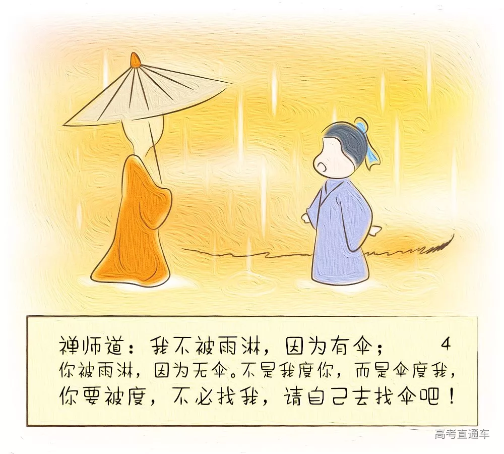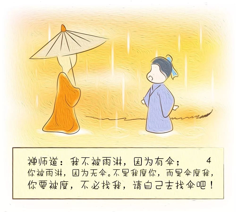 禅师说道:“我在雨中,你也在雨中。我不被雨淋,因为有伞;你被雨淋,因为无伞。所以不是我度你,而是伞度我,你要被度,不必找我,请自找伞!”说完便走了。