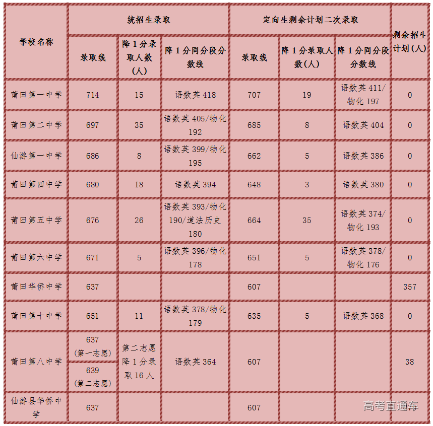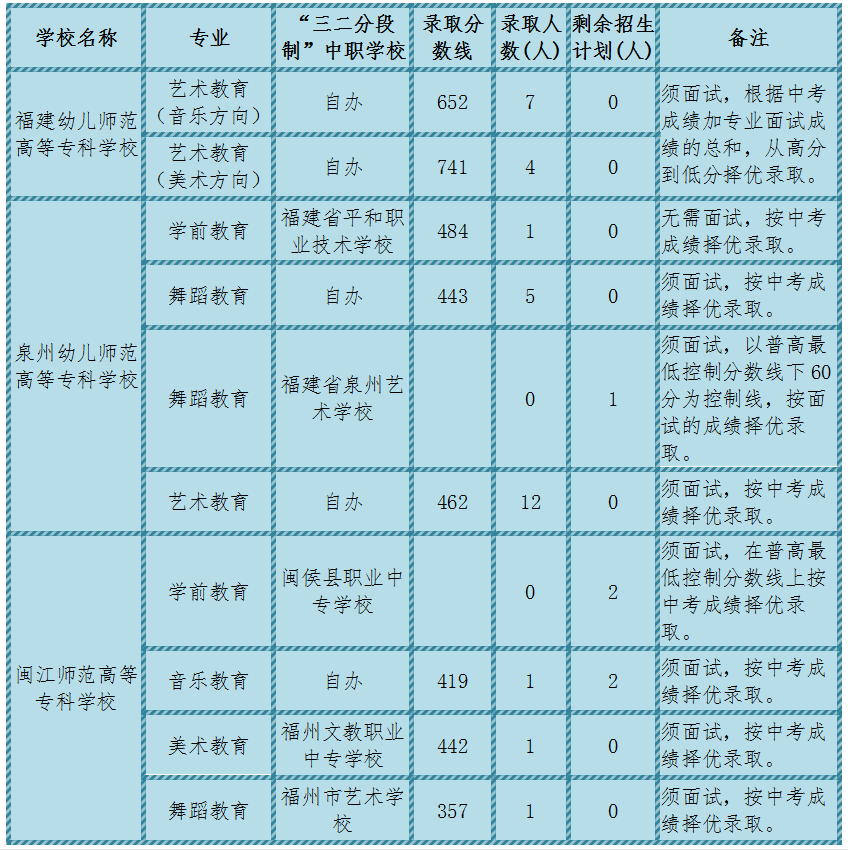 2020年中考五年制高职师范类专业招生 投档录取情况表 (点击看大图) 莆田市2020年省一级达标高中校 切线录取情况表 (点击看大图) 莆田市2020年中考各学科等级划分 情况表 (点击看大图) 温馨提醒 1.五年制师范类高职院校和省一级达标高中校录取结果将于8月11日下午公布,考生及家长可参照查分方式查询投档结果。 2.未完成招生计划的五年制师范类高职院校:泉州幼儿师范高等专科学校舞蹈教育1名,闽江师范高等专科学校学前教育2名、音乐教育2名,参加面试且成绩合格的考生方可补报志愿。 3.未完成招生计划的省一级达标高中校:莆田华侨中学357名、莆田第八中学38名、仙游县华侨中学279名。未投档的考生(除综评等级低于B等级,等级学科出现D等级,考查科目不合格的考生)均可参加以上学校剩余计划志愿补报。 4.补报时间:8月12日8:00-22:00。补报方式:填报方式、账号密码和第一次填报志愿相同,每位考生每批次限报1个志愿。 5.莆田华侨中学直通班第一轮录取线607分,录取人数81名,剩余计划9名,无需补报志愿,将根据莆田华侨中学降分补录情况在该校初高中衔接实验班未投档的学生中按照直通班招生方案择优录取。 6.未经过市招生办平台统一招生,学生自行到学校报名就学的,将不予建立高中学籍,后果自行承担。 7.其他批次的投档录取情况我局将按已公布的录取时间安排表陆续发布,请继续关注招生最新资讯。 莆田市中招委员会办公室 2020年8月11日
