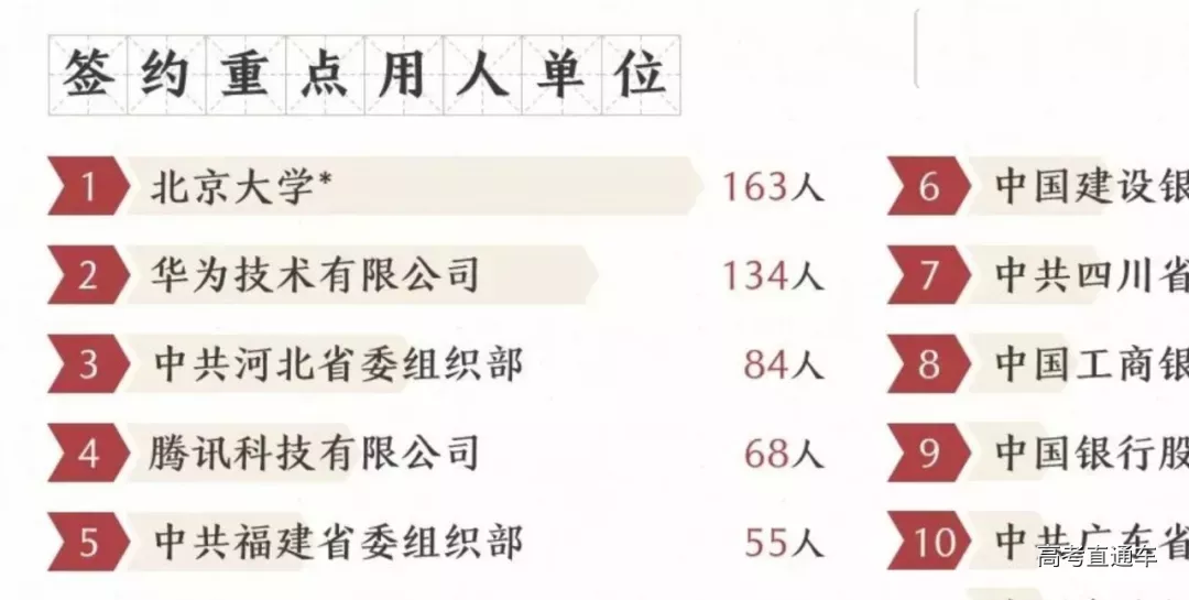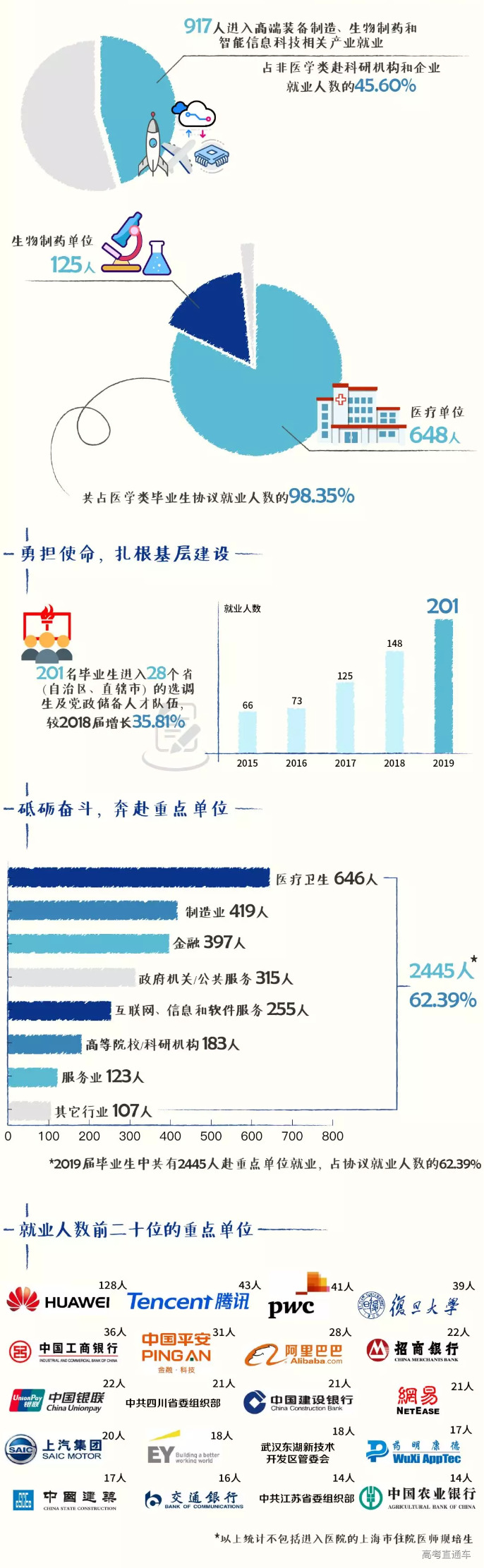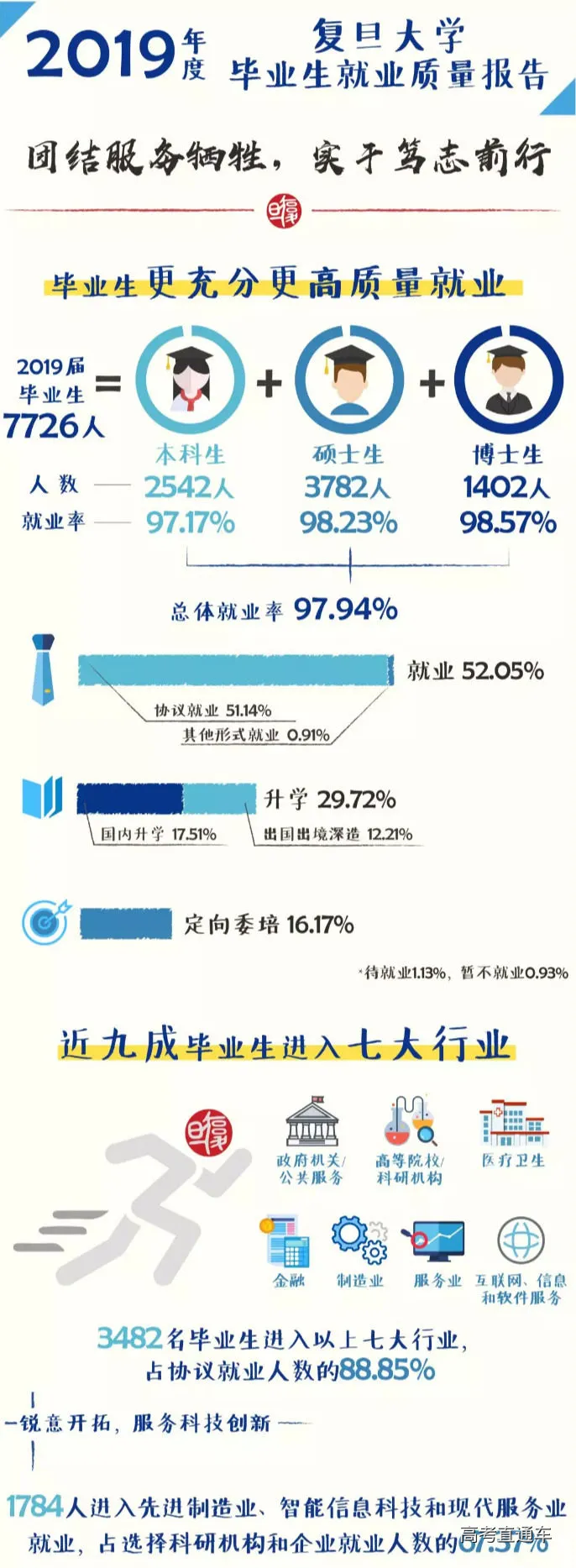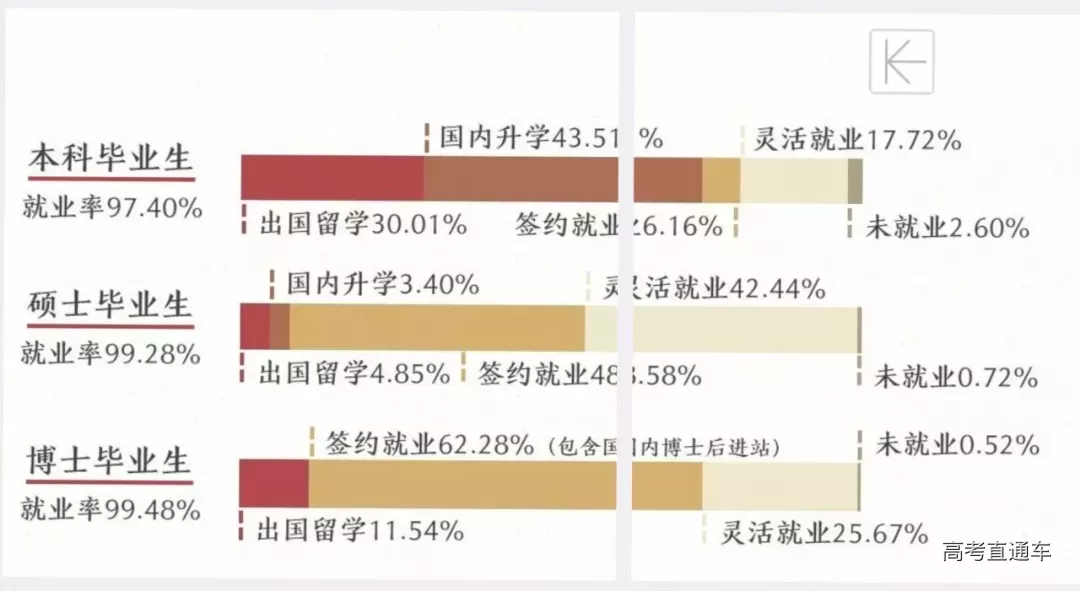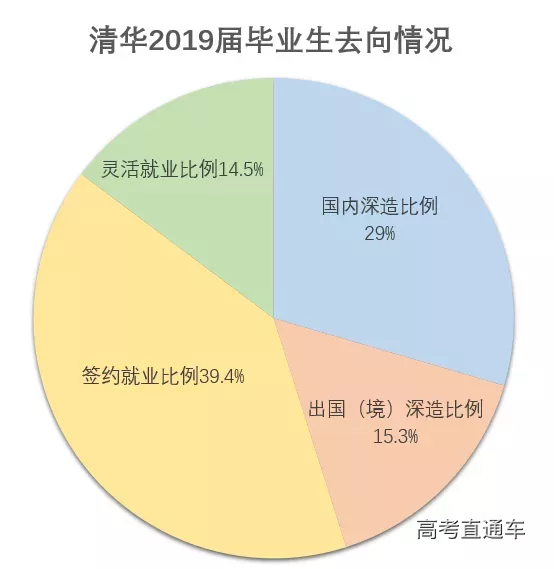 当前,就业形势严峻复杂,许多毕业生在毕业之际都面临着就业问题。去哪就业,是否升学,是否创业等选择,都困扰着毕业生们。作为国内顶尖高校,清华北大等双一流名校毕业生的就业情况,也倍受关注。 今天高考直通车(ID:gkztcwx)带你看看清北等名校毕业生,毕业后都去哪儿了。 清华大学 近日,清华大学举行了研究生教育改革发展大会。会上,校长邱勇作了题为“全面深化研究生教育改革,全面提升高层次人才培养能力”的主旨报告。 其中提到,清华研究生以及本科生毕业后的就业情况。更多同学将人生和事业寄托在祖国大地,国内研究生培养水平和吸引力显著提升,毕业生出国留学比例逐年下降。 2019年清华大学出国深造的研究生占比8.4%,本科生占比24.6%。 北京大学 在2019年北京大学毕业生就业质量年度报告披露的数据显示,全校毕业生合计9904人,校本部毕业生7808人。截至2019年10月31日,校本部总体就业率为98.66%,毕业生总体就业率继续保持高位。 此外,2019年毕业生就业,在行业和地区分布上更趋合理,重点领域就业和自主创业人数继续增加,培养质量持续提升,毕业生就业满意度和雇主满意度进一步提高。 其中两个数据可以让我们有一些参考。 一个数据是,金融已经不再是北大毕业生去向最多的行业。2019年北大毕业生有23.03%选择了教育行业,金融以19.88%排名第二。 不知是金融行业缩招,还是北大毕业生的主动选择,但在经济周期的影响下,行业的变化已经众所周知:金融不再是最吃香的行业,因为金融的影响,财会专业变得高学历人才扎堆,其他行业也受到各种不同程度的影响。 另一个数据是,北大毕业生的升学率仍然居高不下,而灵活就业率增长迅速。 复旦大学 上海交通大学 上海交通大学2019年毕业生共8944人(不含港澳台及留学生),其中,博士生1352人,硕士生4035人,本科生3557人。 上海交通大学2019年毕业生就业率为98.19%。其中,本科、硕士和博士毕业生的就业率分别为96.85%、99.06%和99.11%。2019年毕业生到中西部、基层和国家重要行业关键领域就业的比例达66.44%,毕业生就业引导率逐年上升,实现了2019年毕业生更加充分就业和更高质量就业。 2019年,毕业生到中西部、基层和国家重要行业关键领域就业的比例达66.44%,与去年基本持平。就业人数超过10人的就业单位达760家。毕业生主要赴军工、电力电网、通信、汽车、智能装备制造、金融、医疗卫生、互联网等行业领域就业。 华为依然是就业人数最多的企业单位,人数为336人,与去年相比有较大幅度增长,去年为211人。 选择国内升学的共有2105人。绝大多数留在本校升学有1870人,比例为88.84%;其次C9高校(除本校外)有138人,比例为6.56%;第三为双一流高校(除C9外)有41人,比例为1.95%。 除本校外,录取我毕业生人数排前三位的高校和科研院所分别是复旦大学(54人)、清华大学(35人)、北京大学(31人)。 选择出国(境)深造的学生共计1034人,其中硕士生164人,本科生870人。63.54%的毕业生选择美国高校,数量上远超过其他国家和地区。其他出国(境)深造目的地国家和地区依次为:中国香港(77人)、英国(76人)、日本(40人)、澳大利亚(35人)等。