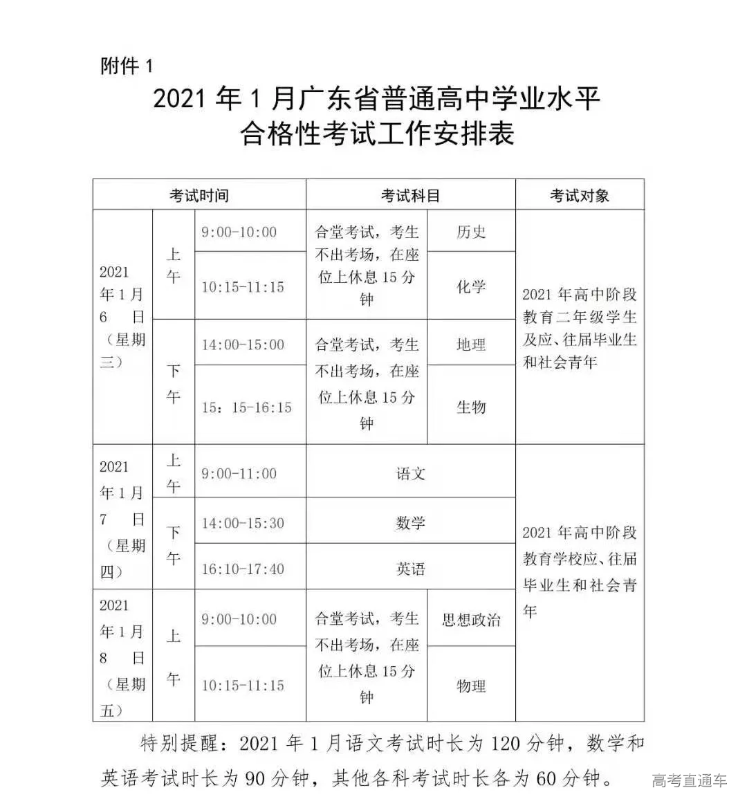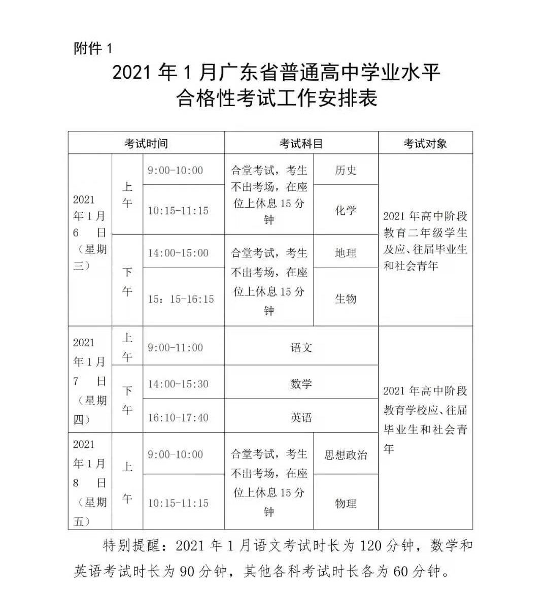 ①2021年1月合格性考试的历史、地理、化学和生物学等4门科目的报考对象一般为2021年具有广东省户籍的广东省高中阶段学校(含普通高中、中等职业教育和技工学校,下同)二年级学生,应、往届毕业生和社会青年也可报考。