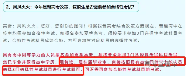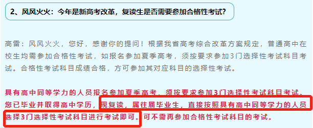 ①往届生:可以不用参加。根据考试院之前的回复,如报名参加夏季高考,须按要求参加3门选择性考试科目考试。复读生属往届毕业生,直接按照具有高中同等学力的人员选择3门选择性考试科目进行考试即可。可不需再参加合格性考试科目的考试。