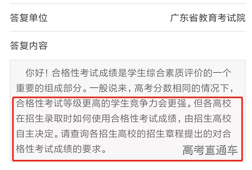 不过有同学向广东省教育考试院咨询:不同批次的大学对合格性考试的等级有要求吗?听说在录取的时候,高考分数相同的情况下,高校会优先录取合格考等级更高的学生?