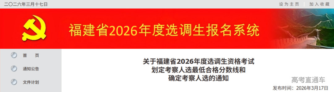 根据《福建省2026年度选调生选拔工作公告》,现将福建省2026年度选调生资格考试划定考察人选最低合格分数线和确定考察人选通知如下。
