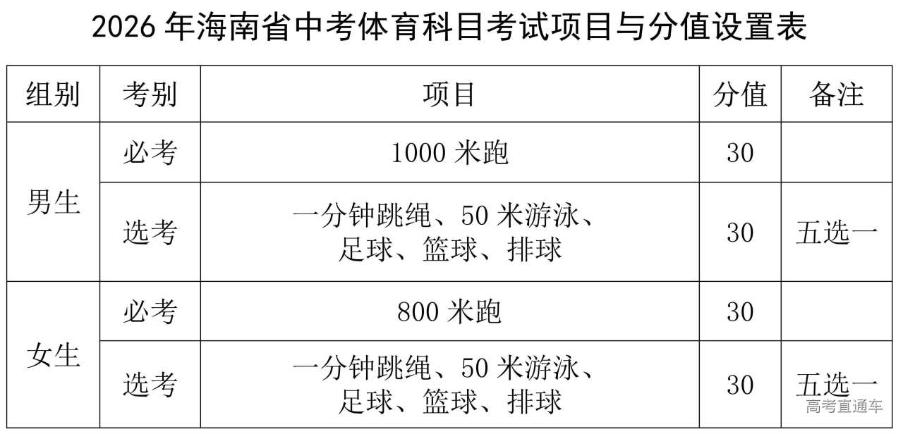 2026年中考体育科目考试的必考项目为男生1000米跑、女生800米跑,分值30分;选考项目为男、女生均从指定的5个项目中选择1项作为考试项目,分值30分,5个项目分别是一分钟跳绳、50米游泳、足球、篮球、排球(项目及分值设置见下表)。
