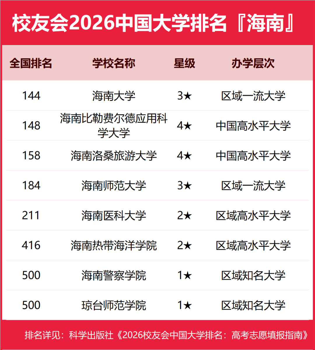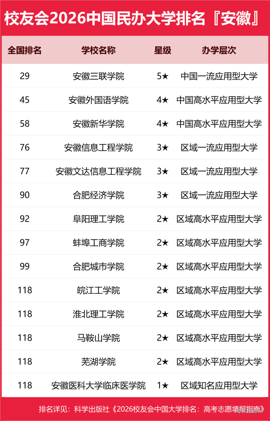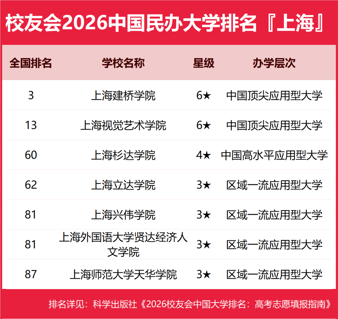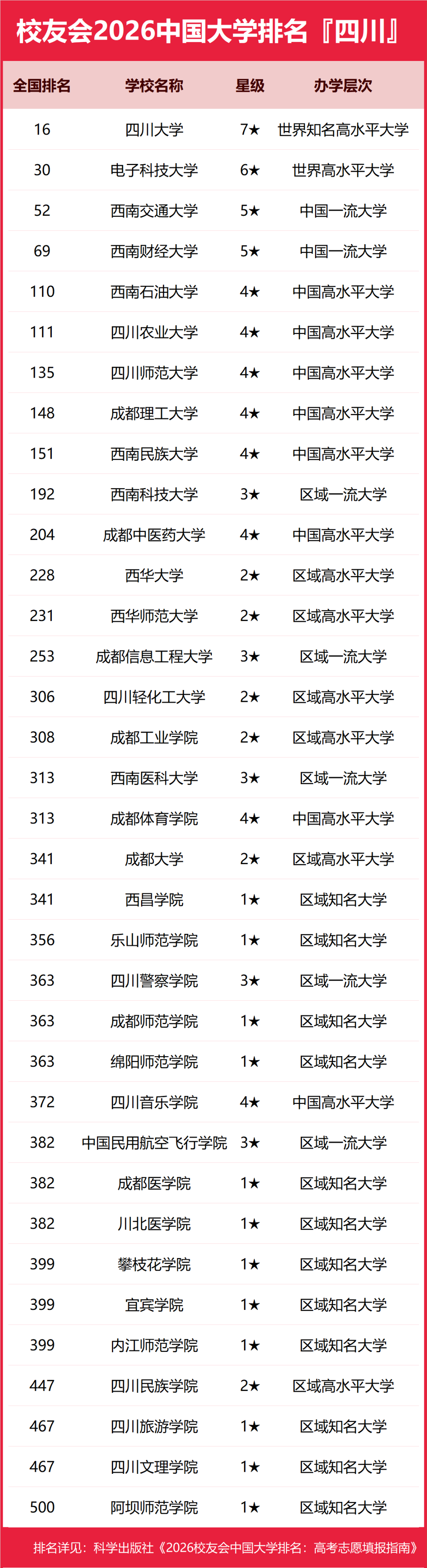 为了给2026年全国考生和家长提供志愿填报参考指南,2026年1月12日,全国第三方大学评价机构艾瑞深校友会网(Cuaa.net)撰写完成、科学出版社即将出版的《2026校友会中国大学排名:高考志愿填报指南》最新发布校友会2026中国各地区大学排名、2026中国各地区民办大学排名、2026中国各地区职业技术大学排名和2026中国各地区高职院校排名。