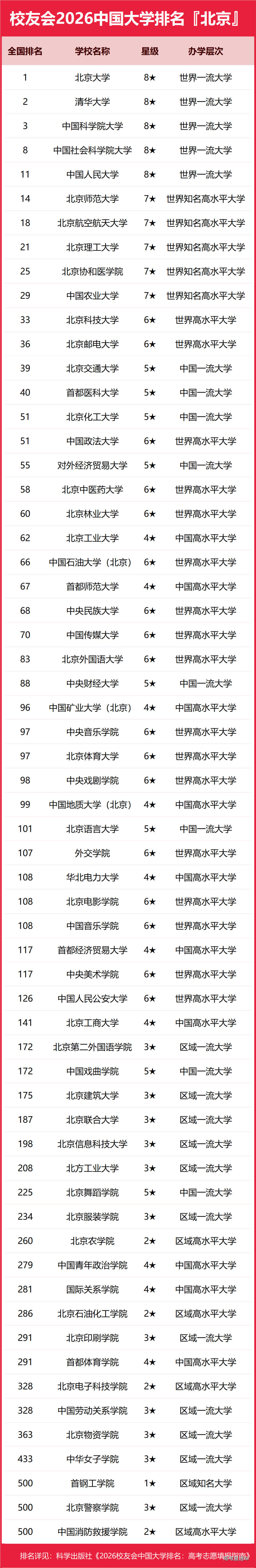 榜单显示,北京大学实力最强,连续20年蝉联中国大学排名冠军,保持霸主地位,雄居校友会2026中国大学排名首位。清华大学第2,中国科学院大学、浙江大学并列第3,南开大学挺进全国前7强。西湖大学、南方科技大学和上海科技大学挺进全国前20强;福耀科技大学首次纳入中国大学排名,跻身全国50强。