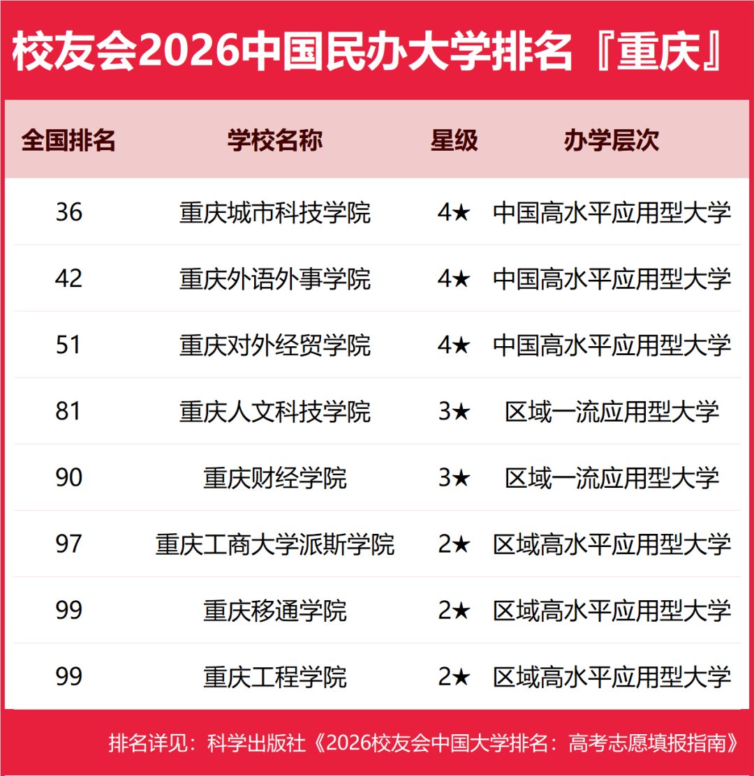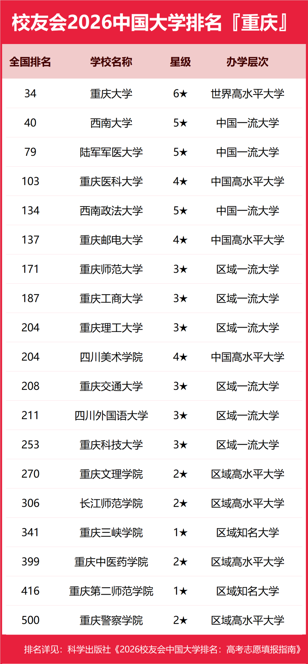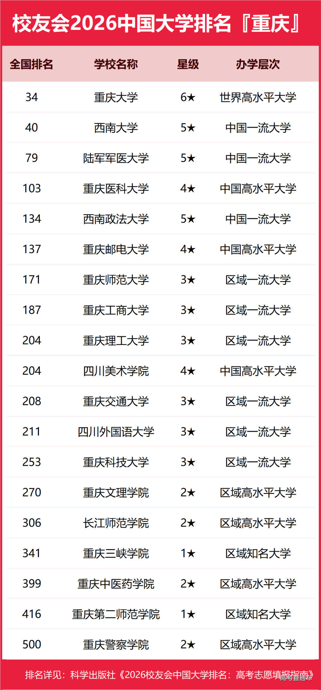 重庆大学问鼎校友会2026重庆市大学排名首位