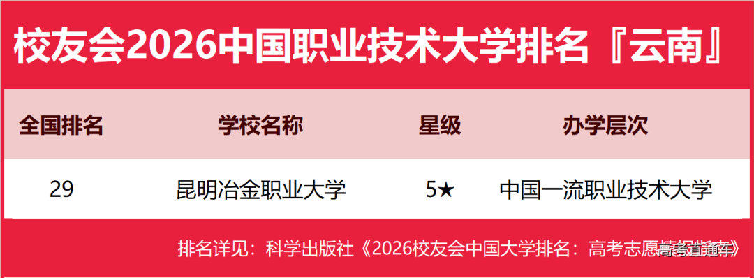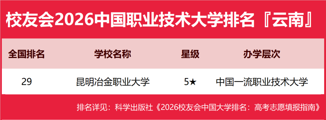 昆明冶金职业大学位居2026云南省职业技术大学排名榜首