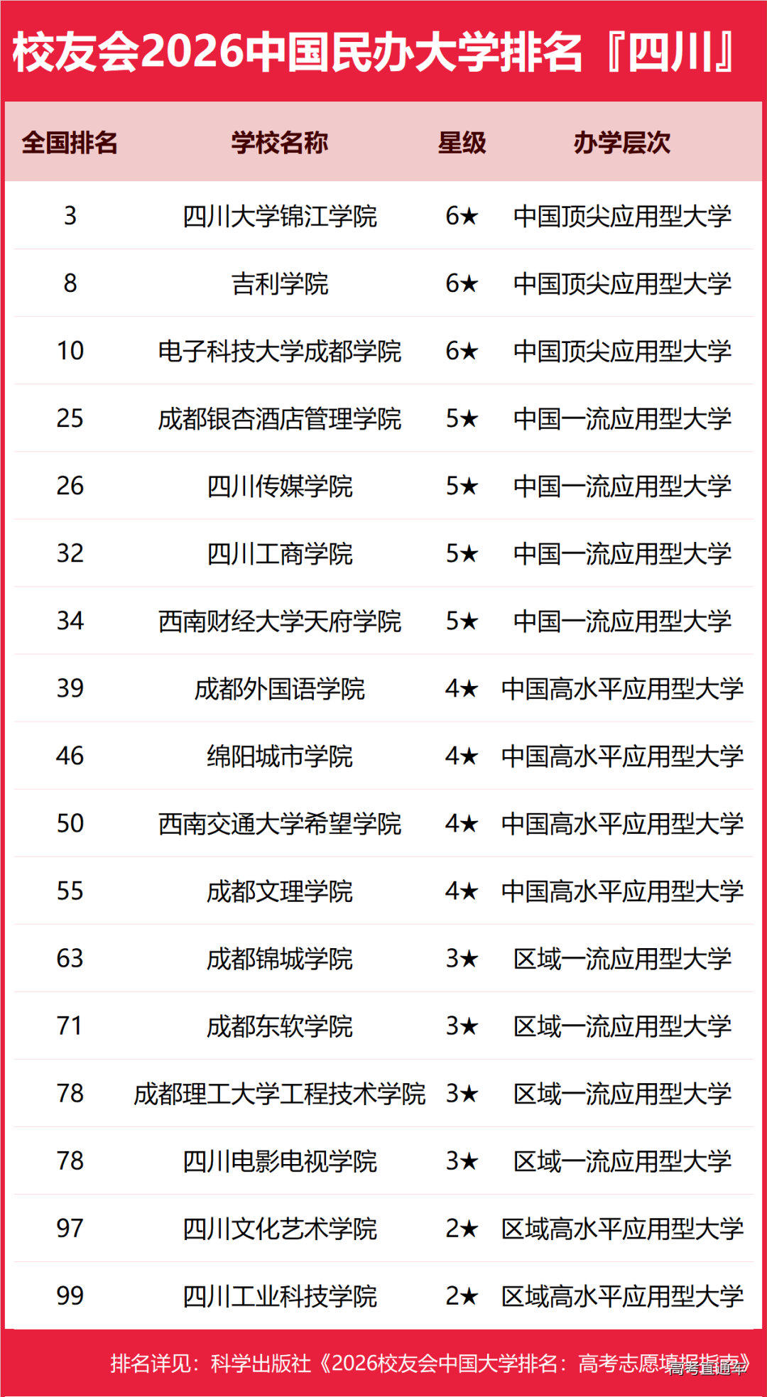 四川大学锦江学院位列2026四川省民办大学排名第一