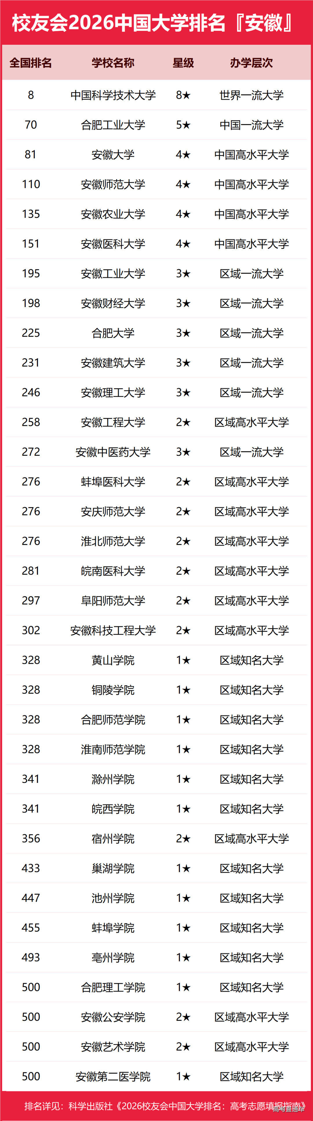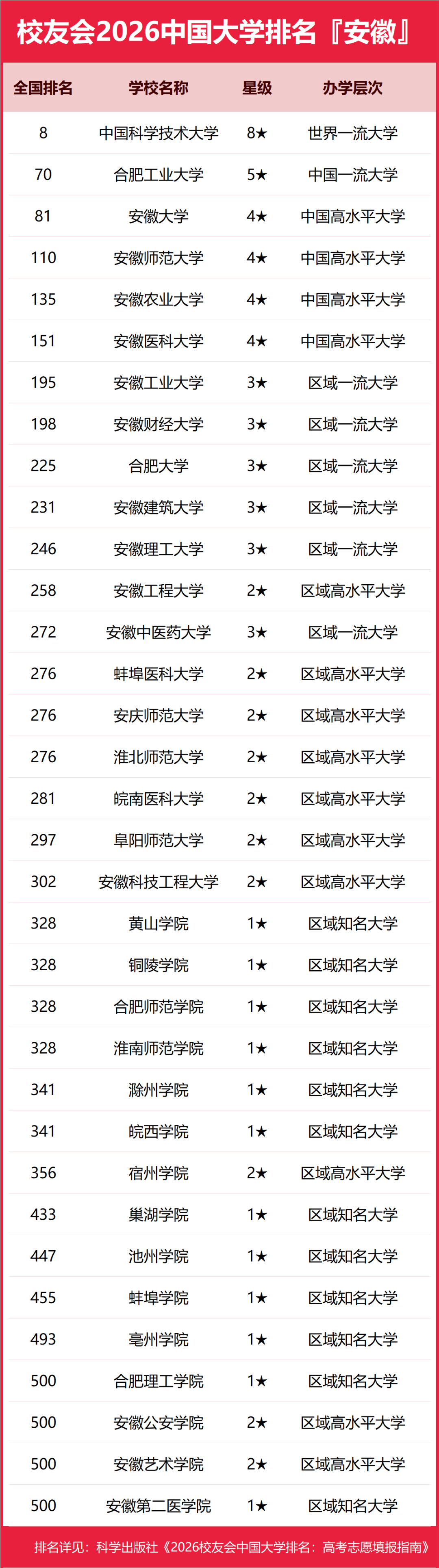 中国科学技术大学问鼎校友会2026安徽省大学排名首位