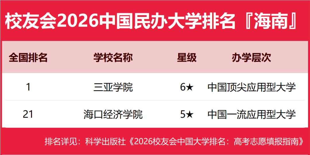 海南科技职业大学、西安汽车职业大学与广东工商职业技术大学高居2026中国民办职业技术大学排名前3强。江西新能源科技职业学院、洛阳科技职业学院与广东亚视演艺职业学院高居2026中国民办高职院校排名前3强。