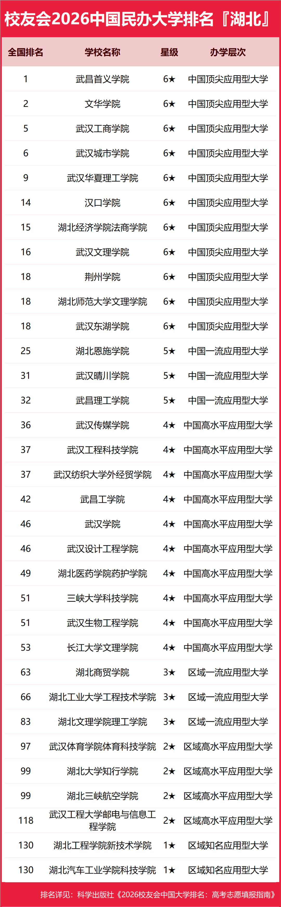 武昌首义学院、文华学院、上海建桥学院与齐鲁理工学院高居2026中国民办大学排名I类前3甲。三亚学院、广州南方学院与四川大学锦江学院高居2026中国民办大学排名Ⅱ类前3甲。西安欧亚学院、昆明城市学院、福州外语外贸学院与山东协和学院高居2026中国民办大学排名Ⅲ类前3甲。