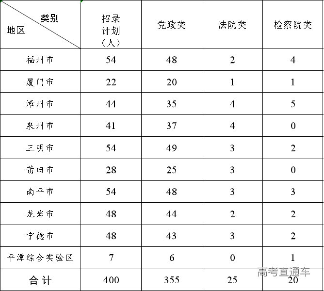 (一)计划从福建省内外〔不含国(境)外,下同〕部分高校福建生源2026年全日制应届硕士、本科优秀毕业生中,选拔选调生400名,其中:党政类355名、法院类25名、检察院类20名。