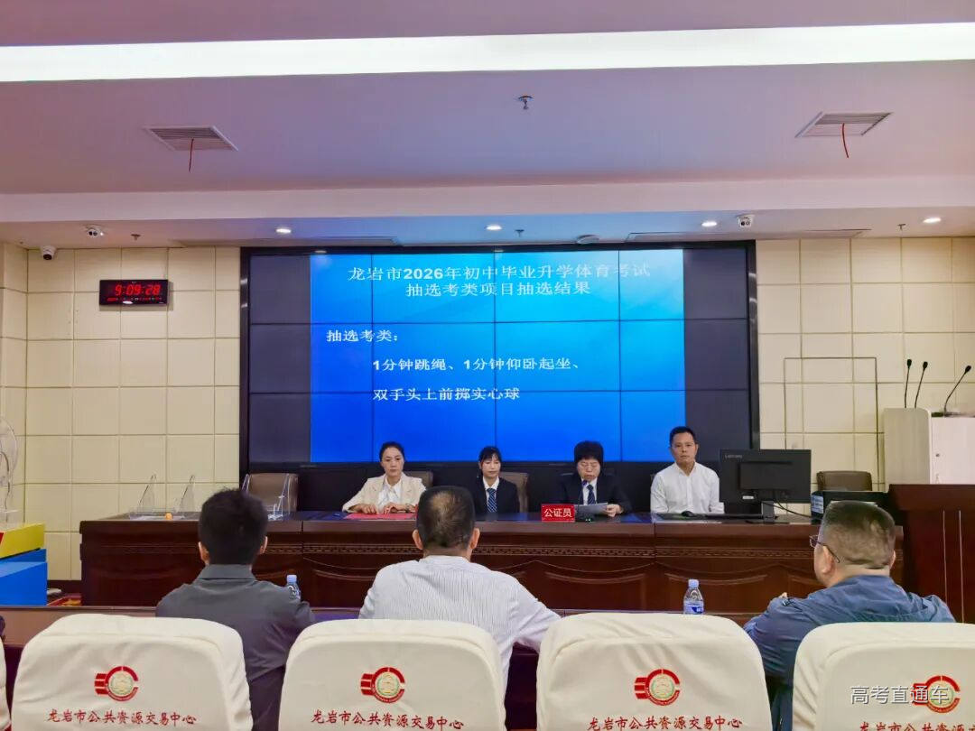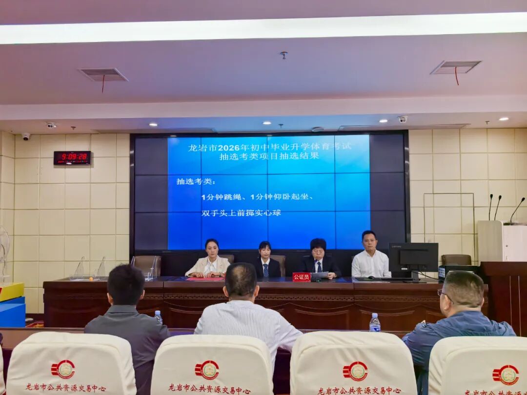 11月11日9时,市教育局在市公共资源交易中心进行2026年龙岩市初中毕业升学体育与健康考试项目抽取工作,采用现场摇号抽签方式确定了明年龙岩中考抽选考类项目。